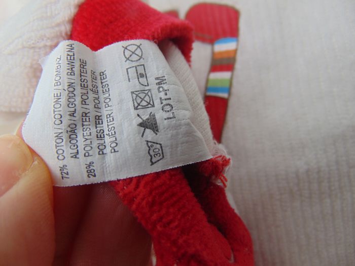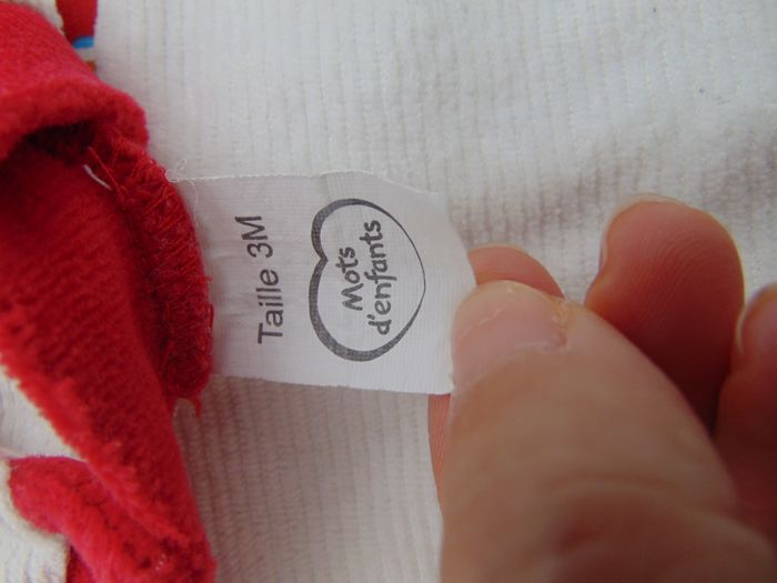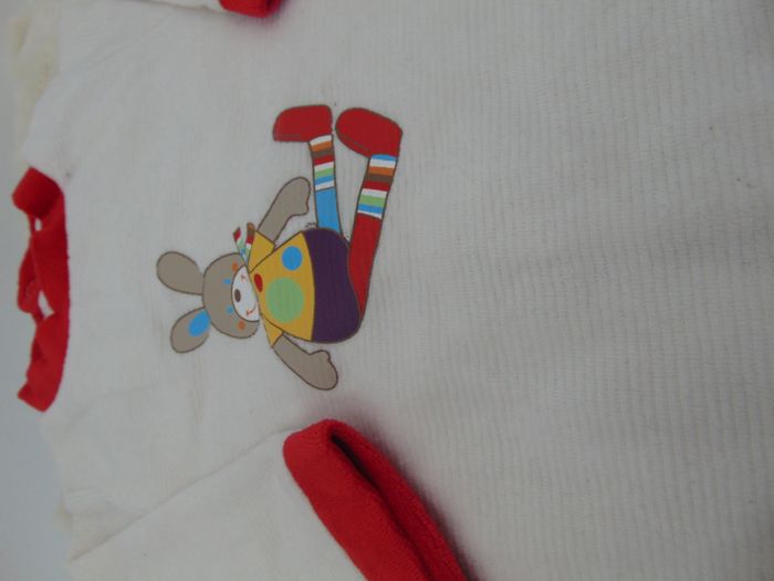 - Matière velours - Fermeture dans le dos avec pressions - Couleur blanc avec col et poignet rouge - Dessin lapin multicolore - Pompons sur les pieds - Aucune tâche ni trou