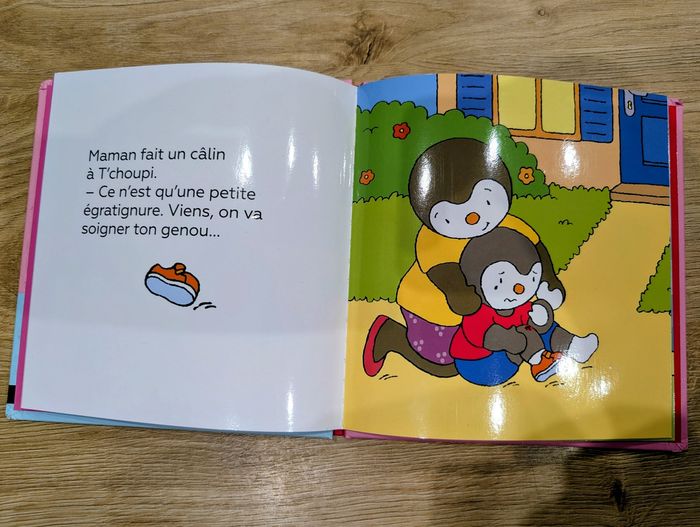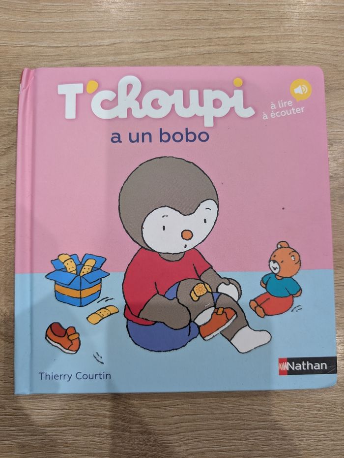 Livre T'choupi a un bobo. Super petite histoire. Les pages sont en plastique.