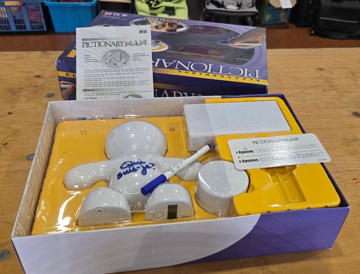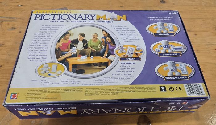 Pictionary Man est un jeu de société familial qui combine Pictionary, mime et charades. Il faut dessiner, mimer et faire deviner les mots à ses coéquipiers. Ce jeu est une version revisitée d’un classique. Fonctionne avec des piles. Jeu complet en bon voir très bon état général. De la marque Mattel dès 14 ans.