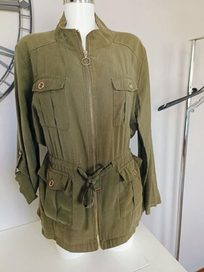 très belle veste (rend moins bien en photo car le kaki ressort mal et le mannequin n est pas adapté a la taille) taille XL 46_48 convient a parti du 44 fermeture eclair dorée ceinture a nouer a la taille permet de cintré la taille a votre guise poches en bas et poitrines avec boutons pressions dorés manches longues retroussable #cath85taille44 #cath85taille46 #cath85taille48 #cath85tailleXL