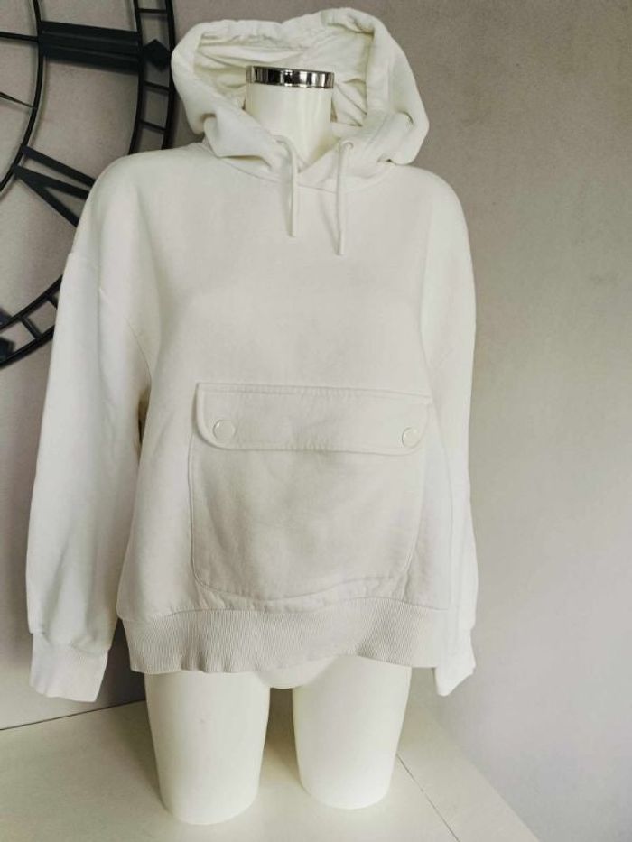sweat a capuche blanc pimark TXL avec grande poche ventrale devant rabat avec 2 pressions idéal lors des vacances ou promenade çà permet d'avoir le telephone toujours a porter de main pour les photos sans avoir a le garder toujours en main ou le remettre et ressortir du sac ou y mettre ce que vous voulez #cath85tailleXL #cath85taille42 #cath85taille42/44 #cath85taille44 #cath85taille46