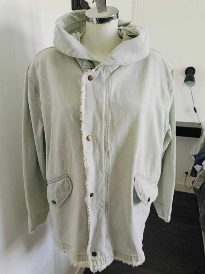 veste ne jean bleue très clair pas d 'étiquette poche a rabat pression de chaque coté capuche effiloché d'origine sur le rabat qui cache la fermeture le bout des manches et le bas de la veste épaule a épaule 53cm aisselle a aisselle 62cm longueur 72cm acheté en seconde main mais jamais portée n'hésitez pas a faire un lot réductions possible en lot . #cath85tailleunique #cath85grandetaille