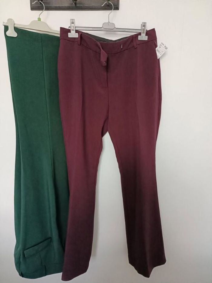 2 pantalons neufs identiques un bordeaux étiqueté un vert neuf (l étiquette s'est détachée je l'avais mise de coté pour la vente mais je ne la retrouve pas peut etre partie a la poubelle lorsque j'ai modifié mon dressing mais il est totalement neuf ils ne me conviennent pas) taille 46 négociable dans la limite du raisonnable possibilité de vente au détail dans ce cas me contacter #cath85taille46