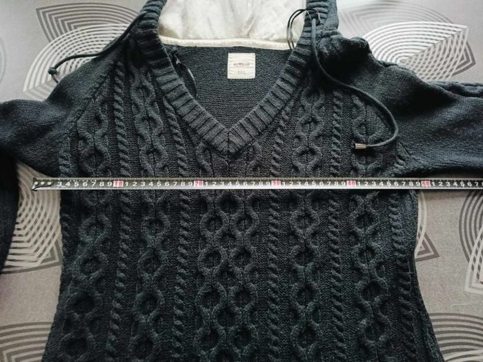 très beau pull long a capuche marine a torsade taille noté XXL mais taille petit aisselles 40cm a plat longueur 80cm pull acheté en seconde main la vendeuse avait notée XXXL et m'avait assuré qu'il taillait bien aujourd'hui en remettant en vente et en reprenant son annonce je me rend compte que elle avait mis XXXL je le vois trop tard je ne peux pas ouvrir de litige ) dans tous les cas il ne correspond pas au XXL comme dit l'etiquette il convient pour un 40 - 40/42 poche kangourou #cath85taille40 #cath85taille42 #cath85tailleL
