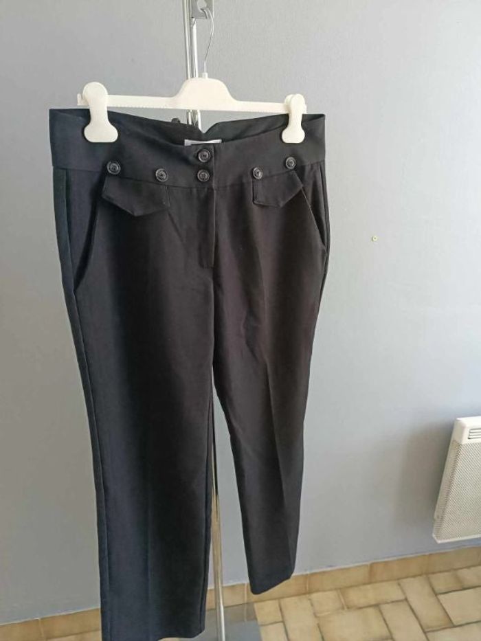 pantalon style tailleur taille 42 boutons pour bretelles je donne les bretelles avec elles sont encore utilisable mais abimées voir derniere photo vous pourrez aussi le porter sans ou les changées mais pour le moment celles ci tiennent encore taille a plat 44cm non extensible long 108cm #cath85taille42