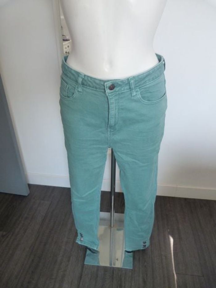 jean vert skinny taille noté 42 mais taille petit taille a plat 38cm extensible jusqu'à 42cm 2 toutes petites taches noires (voir photo) acheté comme ça sur le site jamais pu le porté car la taille indiquée 42 ne correspond pas #cath85tailleM #cath85tailleL #cath85taille38 #cath85taille40