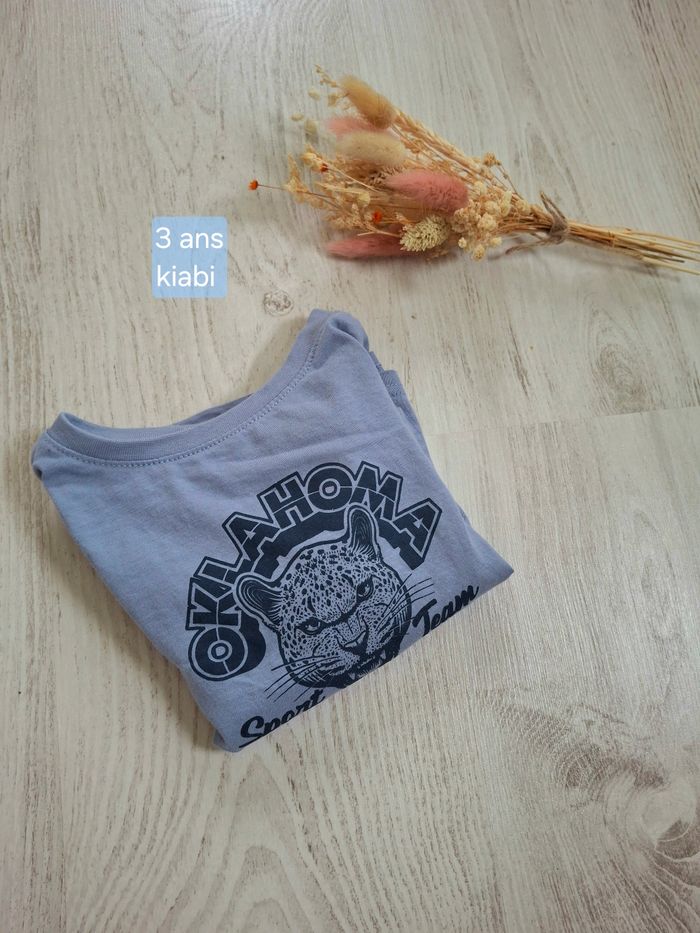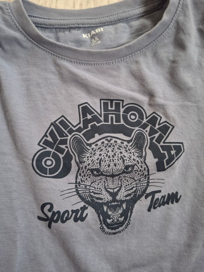 Joli t-shirt bleu doux/gris à manches longues, motif “Oklahoma Sport Team” avec tête de félin. Taille 3 ans – marque Kiabi. En très bon état (peu porté), tissu doux et confortable. Parfait pour l’école ou le quotidien! Pour rechercher des articles garçon 3 ans dans mon dressing: #laure695_garcon_3ans #tshirt#haut#teeshirt#kiabi#mancheslongues#boy#garcon#nino#bambino#bleu#look#3ans#3anos#3yearsold#automne#hiver#printemps#manche#longue#manchelongue