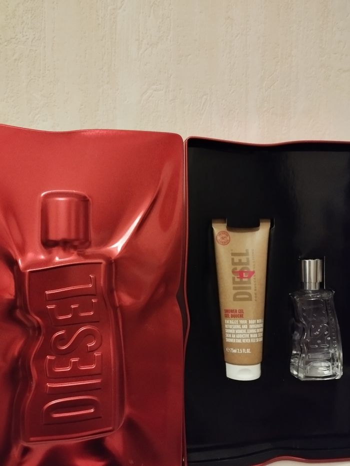 Coffret D by diesel ,eau de toilette 50ml+gel douche ,neuf mais petit défaut sur la boîte en métal un petit décalage à la fermeture sur le côté,visible sur la photo