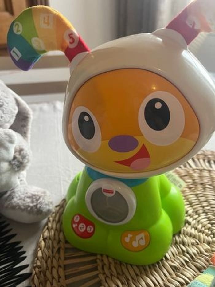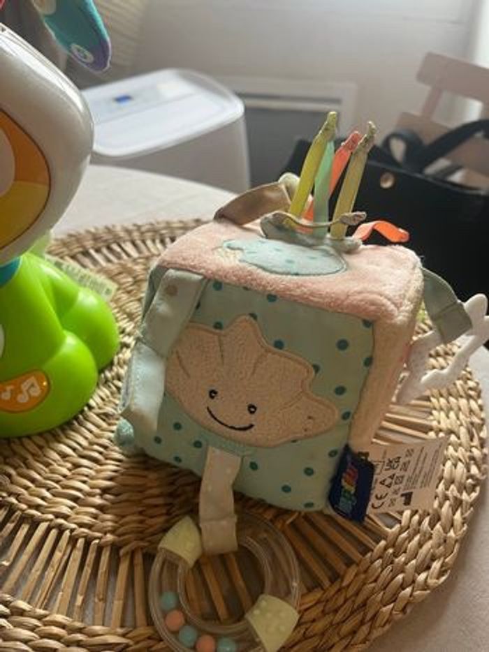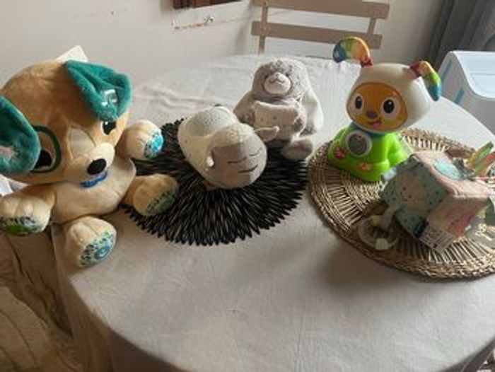 Je vends un lot complet de jouets pour bébé, idéals pour l’éveil, la détente et les moments de jeu. Tout est en très bon état, propre et fonctionne parfaitement. 🧸 Le lot comprend : • Peluche interactive chiot – Musiques, lumières, apprentissages (couleurs, formes…). • Veilleuse mouton – Berceuses et lumière apaisante pour aider bébé à s’endormir. • Peluche lapin toute douce – Parfaite pour les câlins. • Robot éducatif lumineux – Sons, musiques et jeux d’éveil. • Cube d’activités sensoriel – Textures, étiquettes et petites activités pour stimuler la motricité.