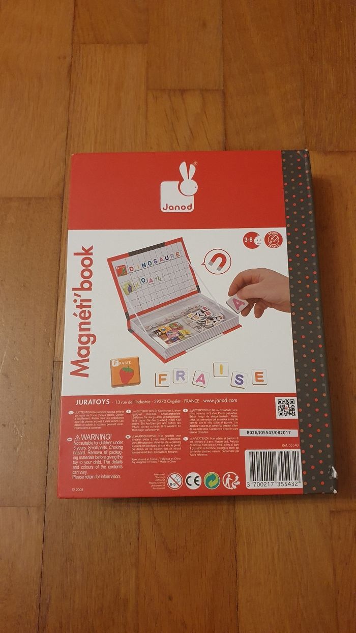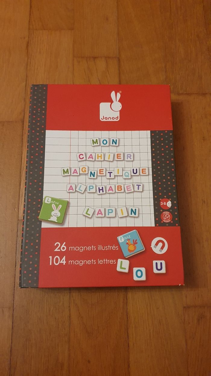 Coffret comprenant des lettres et images magnétiques pour apprendre l'alphabet, les syllabes et les mots.