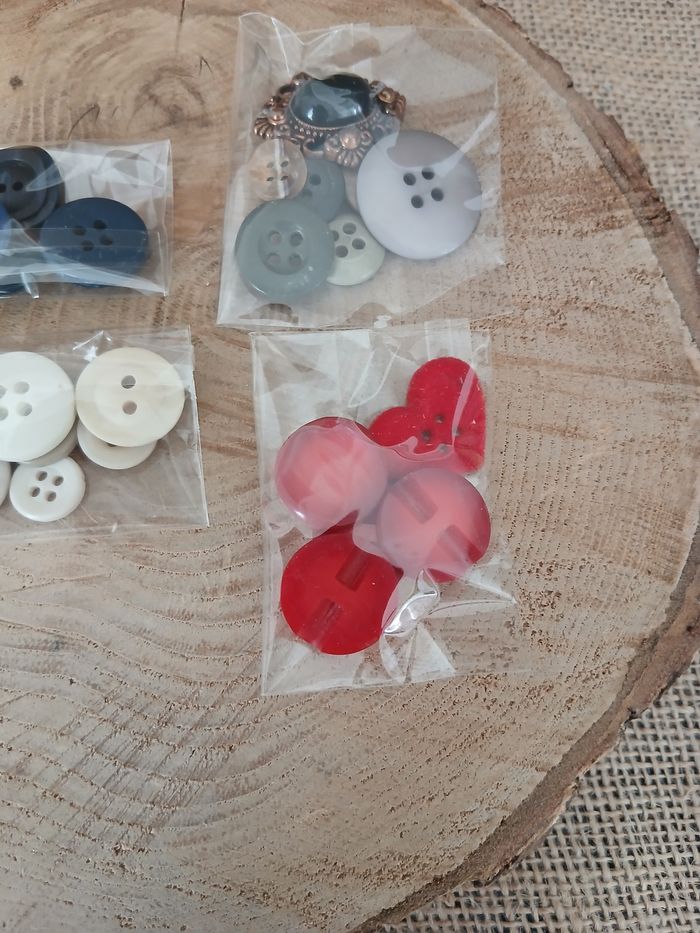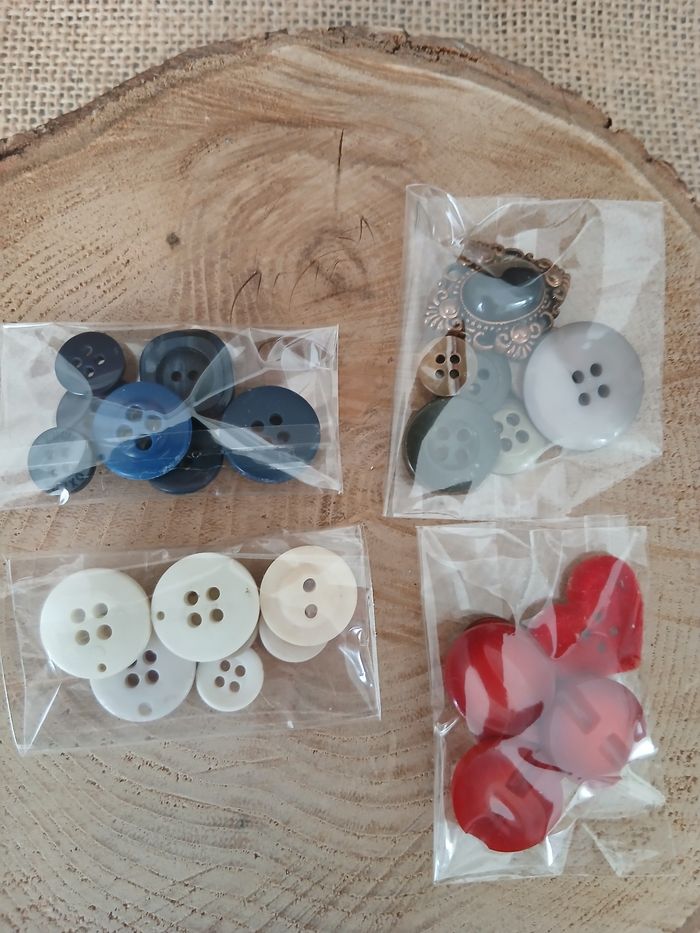 Lot de 4 sachets de boutons. D'autres tissus ruban boutons perles et accessoires biais ect... de dispo ds mon dressing n'hésitez pas à jeter un coup d'œil ou à me demander.