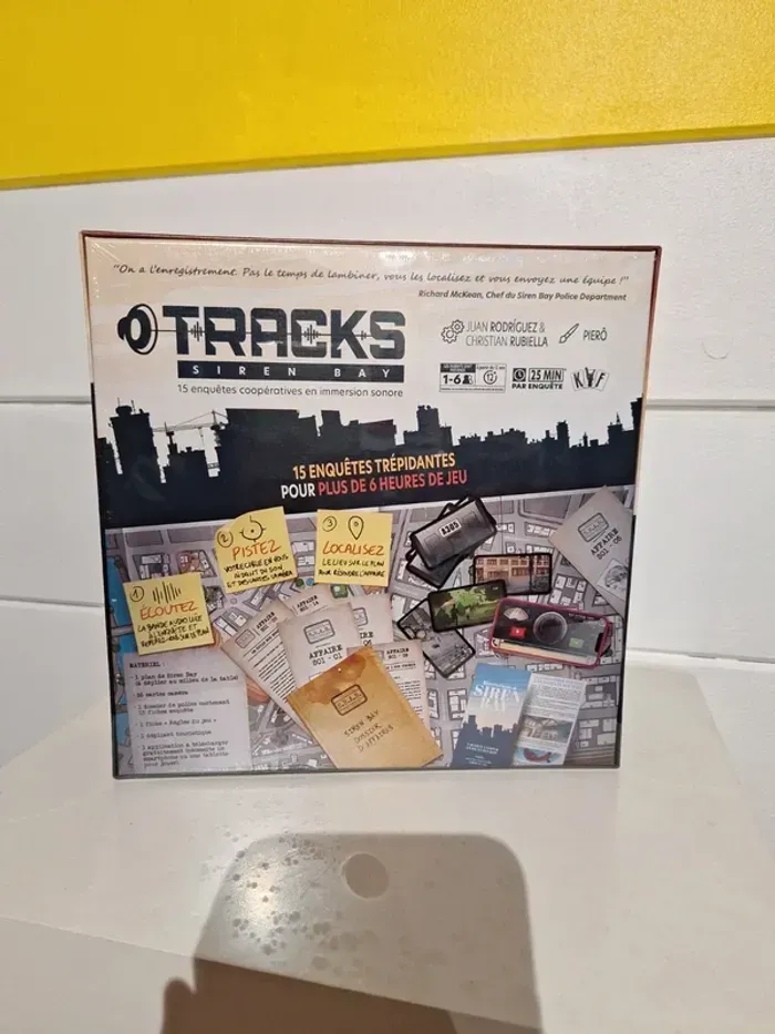 Badaboom : Vente professionnelle - Jeu de société neuf - Prix non négociable Promo 10€ au lieu de 35.70€ TRACKS est un jeu d'enquêtes audio dans lequel vous faites partie de la S.B.A.S (Siren Bay Audio Squad).Cette unité a été fraichement affectée à l'écoute et la vidéosurveillance de la ville de SIREN BAY. Vous devrez résoudre différentes affaires en utilisant un plan de la ville, les caméras de sécurité et surtout les écoutes audio à votre disposition. Ecoutez la bande son de chaque affaire et analysez la pour suivre le trajet de votre cible sur le plan. Vous pourrez alors résoudre l'affaire en localisant précisément votre cible. Le jeu compte 15 enquêtes d'environ 25minutes.