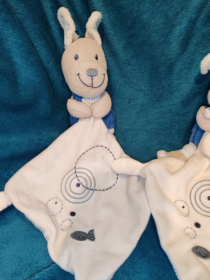 Doudou mouchoir chien POMMETTE Intermarché bleu et blanc cercles poisson 20 cm environ 14.90 euros le lot Envoi en relais
