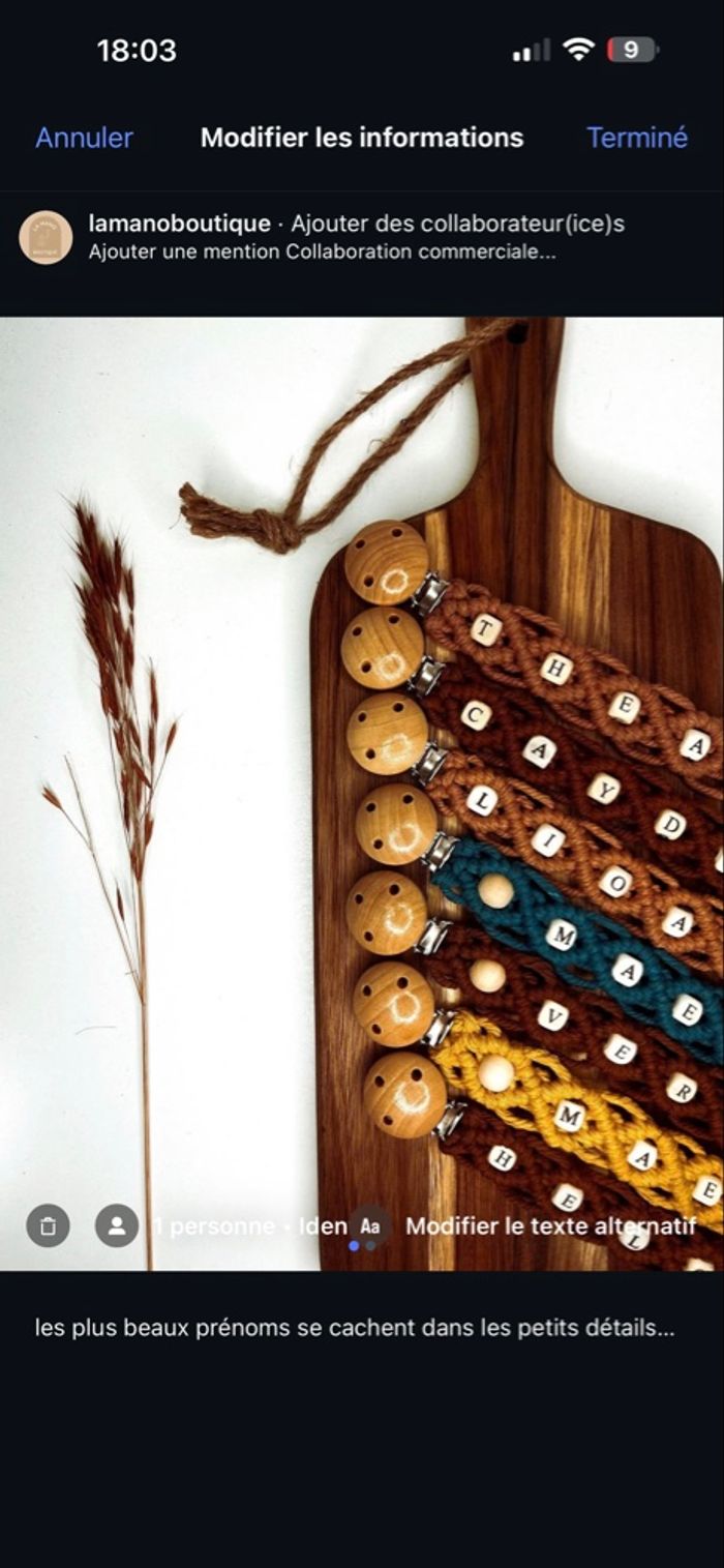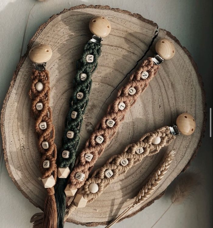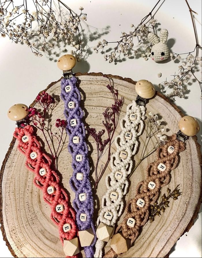 Attache tétine en macramé disponible 15 coloris à la demande. Personnaliser avec le prénom de votre bébé huit caractères maximum. Avant achat, merci de me contacter pour choisir la couleur.