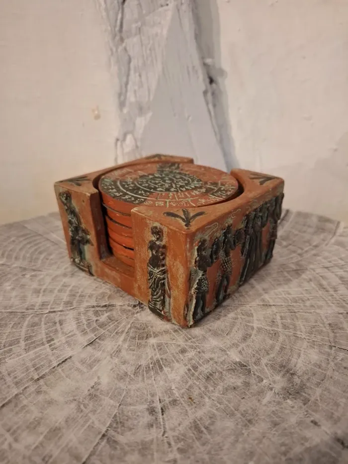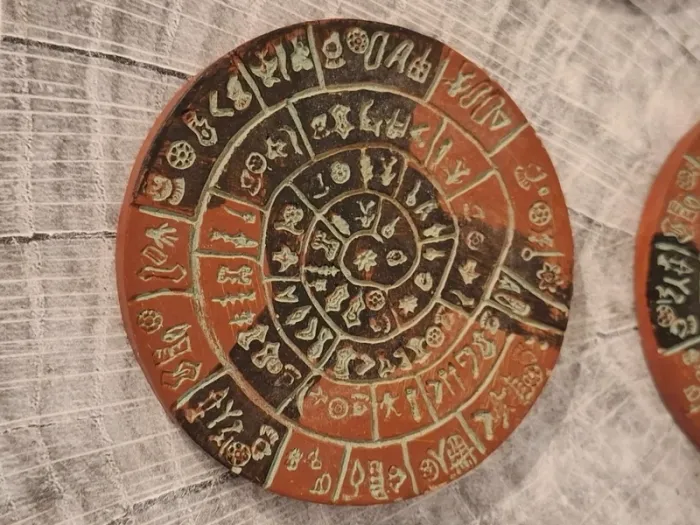 Lot de 6 dessous de verre représentant le disque de Phaistos avec leur support.