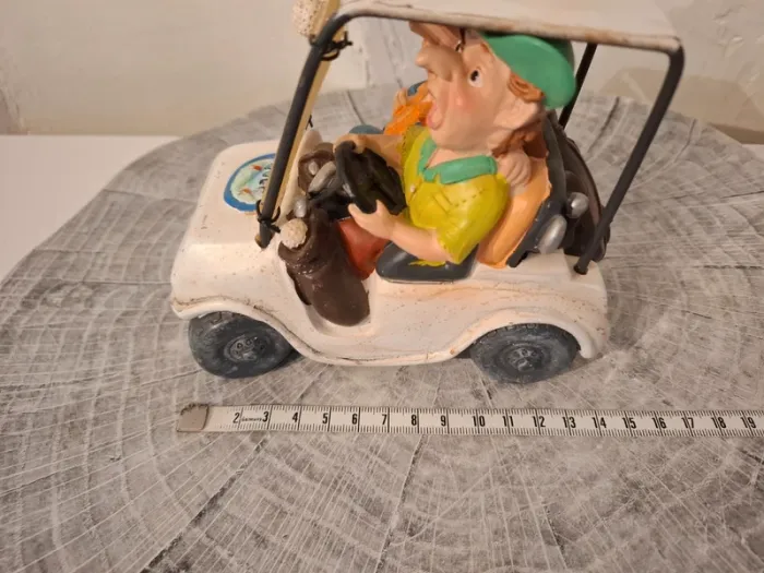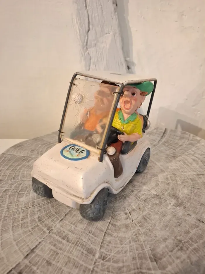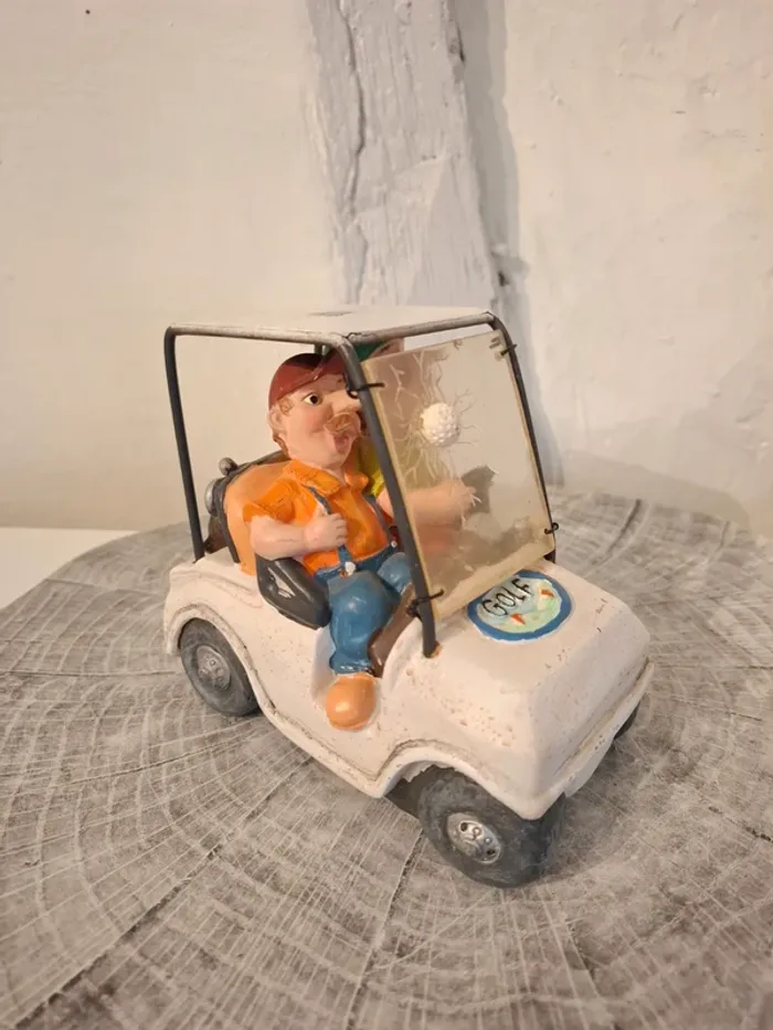 Figurine tirelire en forme de Golfette dans le style de Guillermo Forchino Dimension : 15 cm de longueur et 13 cm de hauteur Attention il manque le bouchon sous la voiturette et un éclat de peinture sur le toit (voir photos)