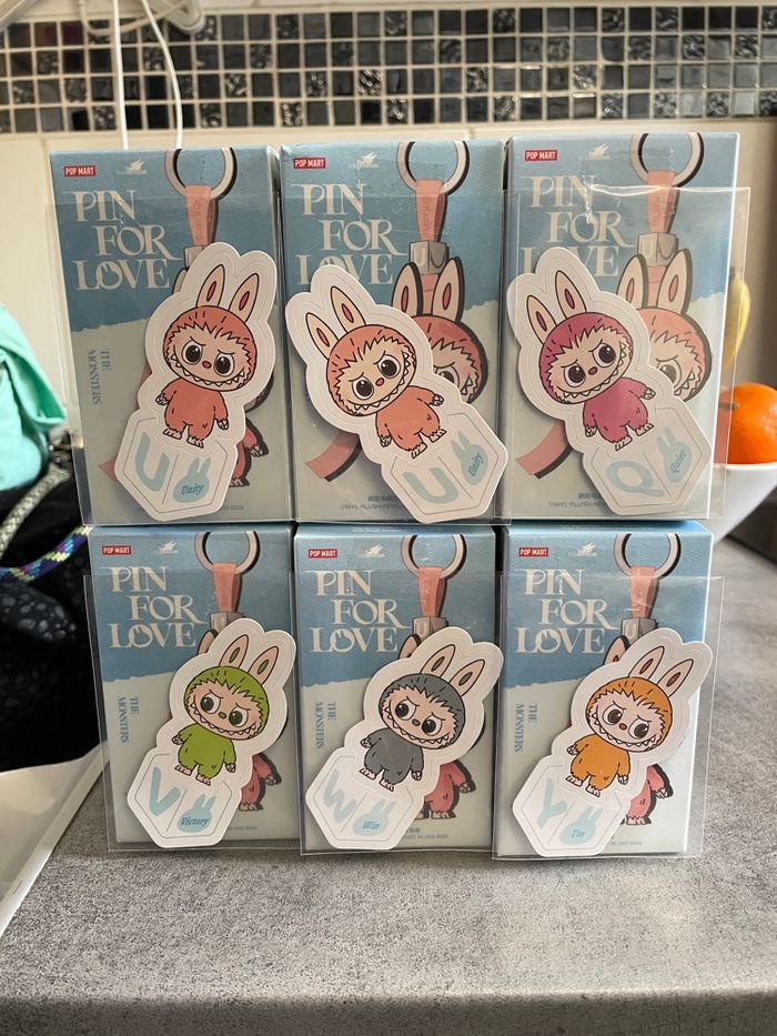 - It features a plush vinyl face hanging charm bag, with POPMART LOGO metal keyring and metal letter cubes
