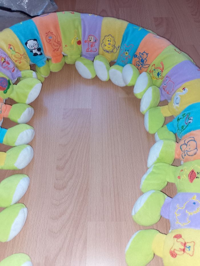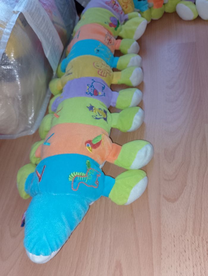 Grande chenille 1000 pattes Chiquetes 1 côté avec les lettres de l'alphabet 1 côté avec des animaux Longueur environ 1,80m Idéal pour bord de lit, décoration...