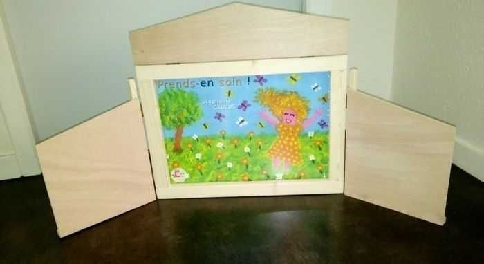 Le conteur fait défiler les planches A3 (42 x 29,7cm) les unes après les autres dans le butaï, il se tient derrière pour lire le texte et les enfants devant voient l'histoire défiler. Ces butaïs sont en bois brut pour des contes format A3 réalisés artisanalement par un menuisier. lls sont légers environ 1,5 kg, ouverts des 2 côtés pour droitiers et gauchers. Vous pouvez les peindre.