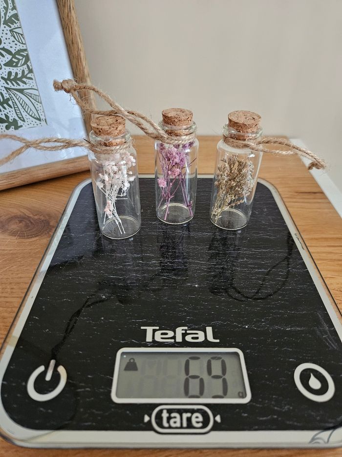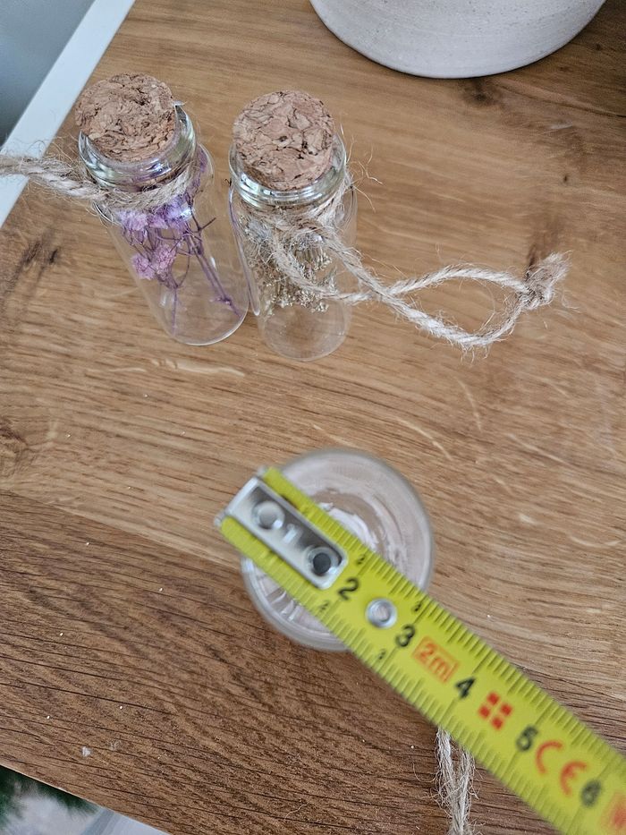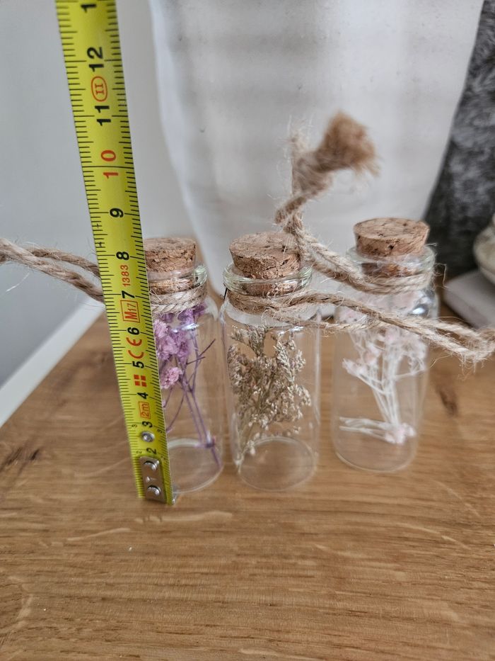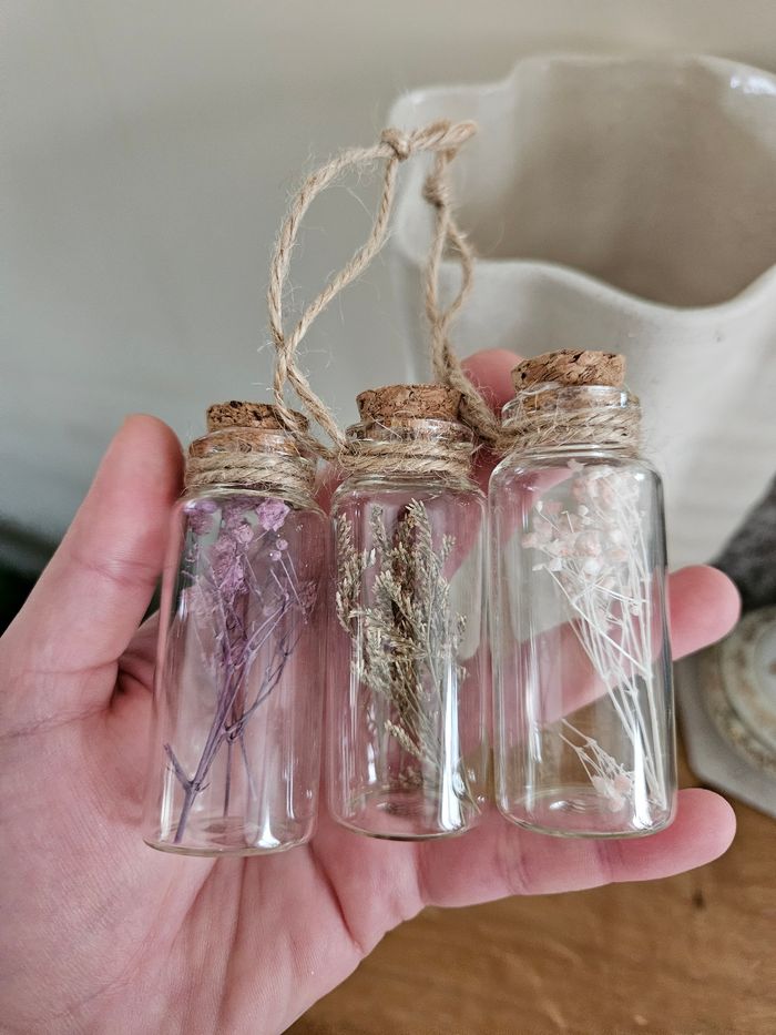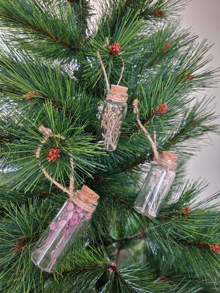 - lot de 3 fioles - suspension pour sapin de Noël - en verre transparent - fermé avec du liège - a l'intérieur des fleurs séchées - mesures et poids sur les photos