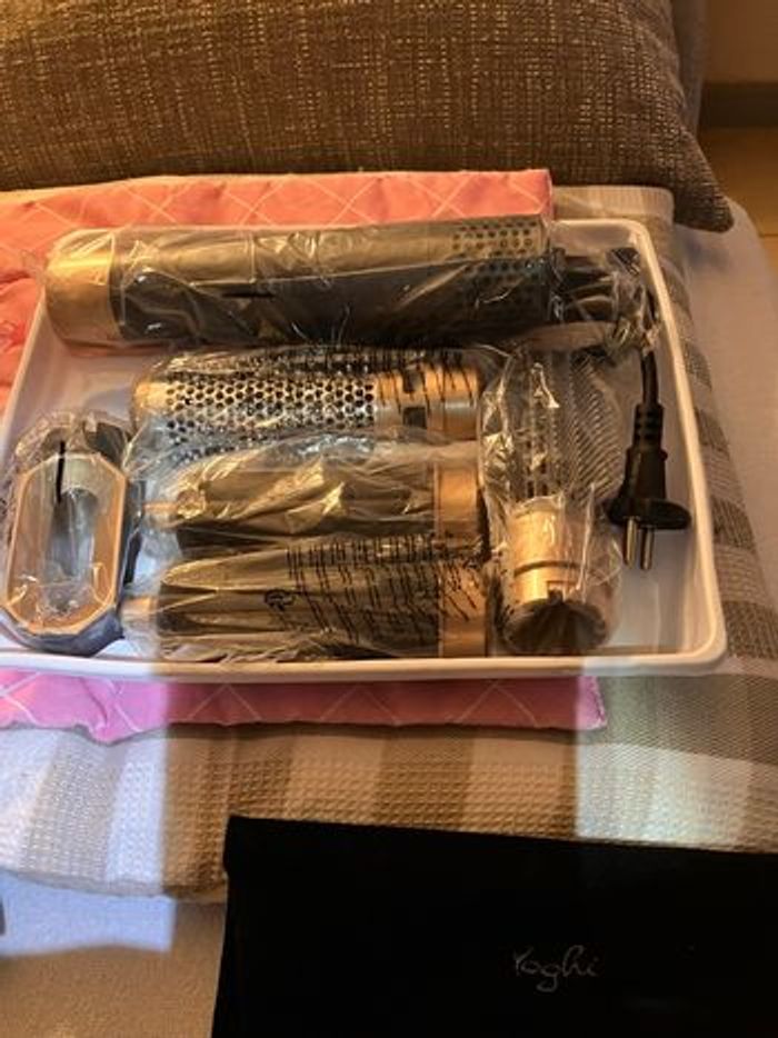 Dans brosse soufflante sèche-cheveux avec un accessoire brosse volumissante plus un accessoires brosse lissante et deux accessoires boucle pour bouclage un côté droit et un côté gauche neuf, avec tout son emballage d’origine, plus un sac de rangement en velours noir