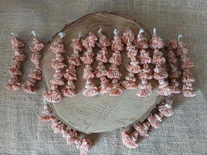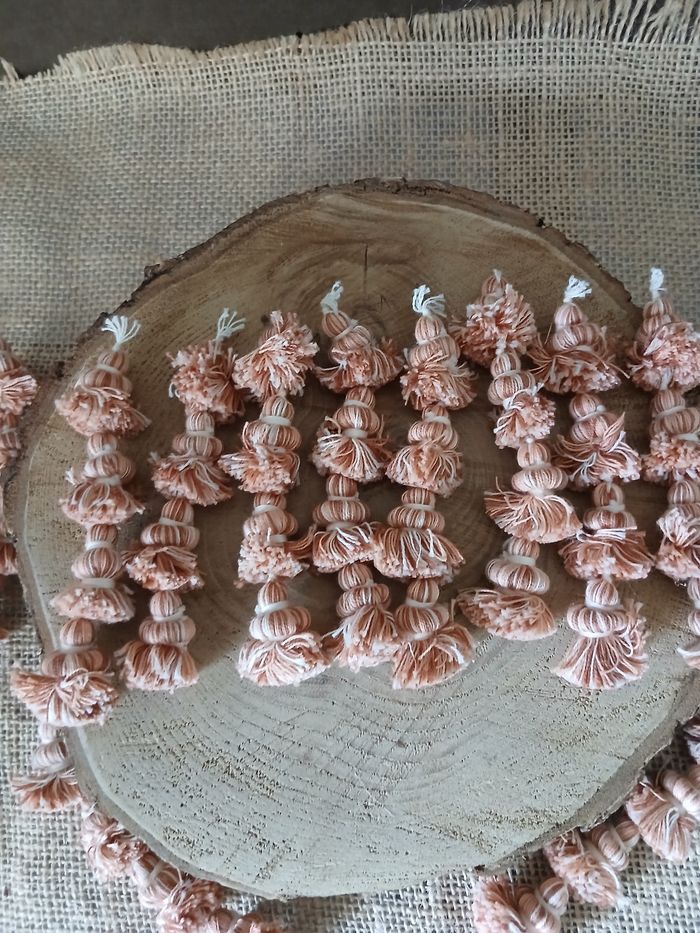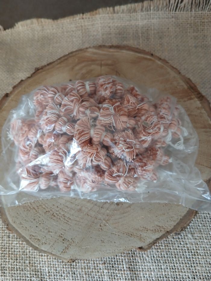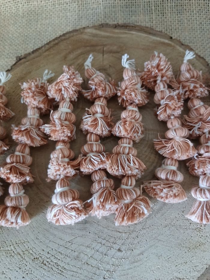 Lot de 14 pompons long saumon beige marron crème. D'autres pompons tissus ruban boutons perles et accessoires biais ect... de dispo ds mon dressing n'hésitez pas à jeter un coup d'œil ou à me demander.