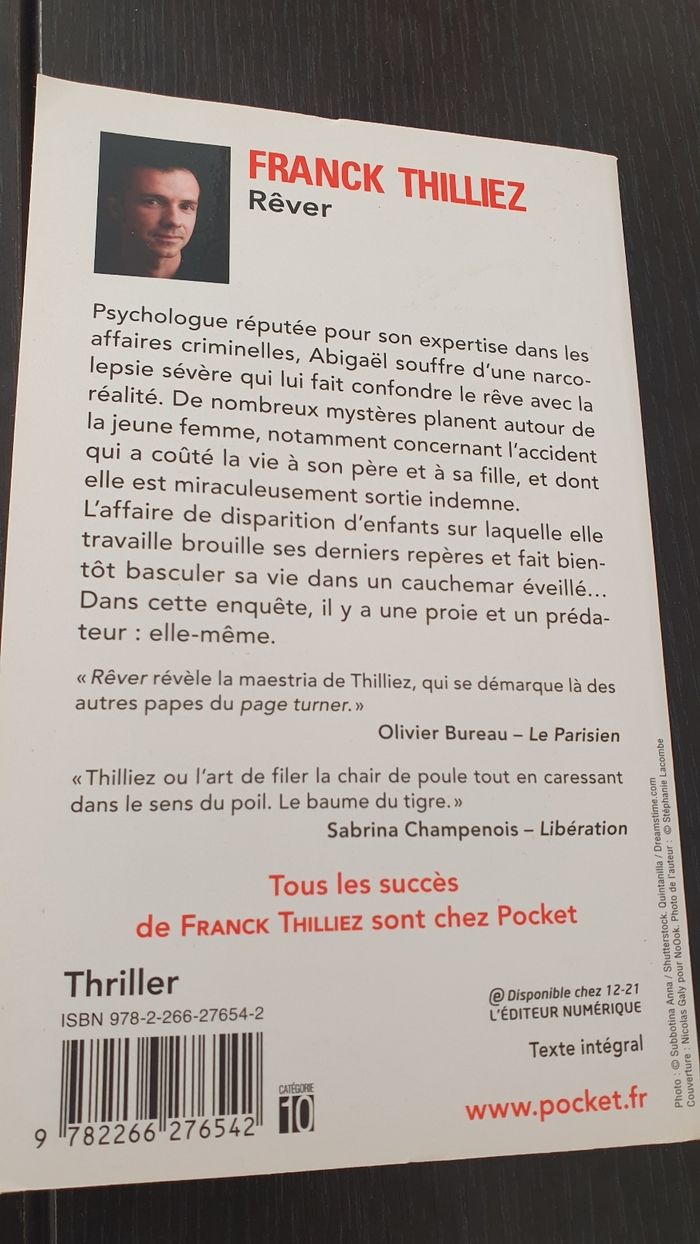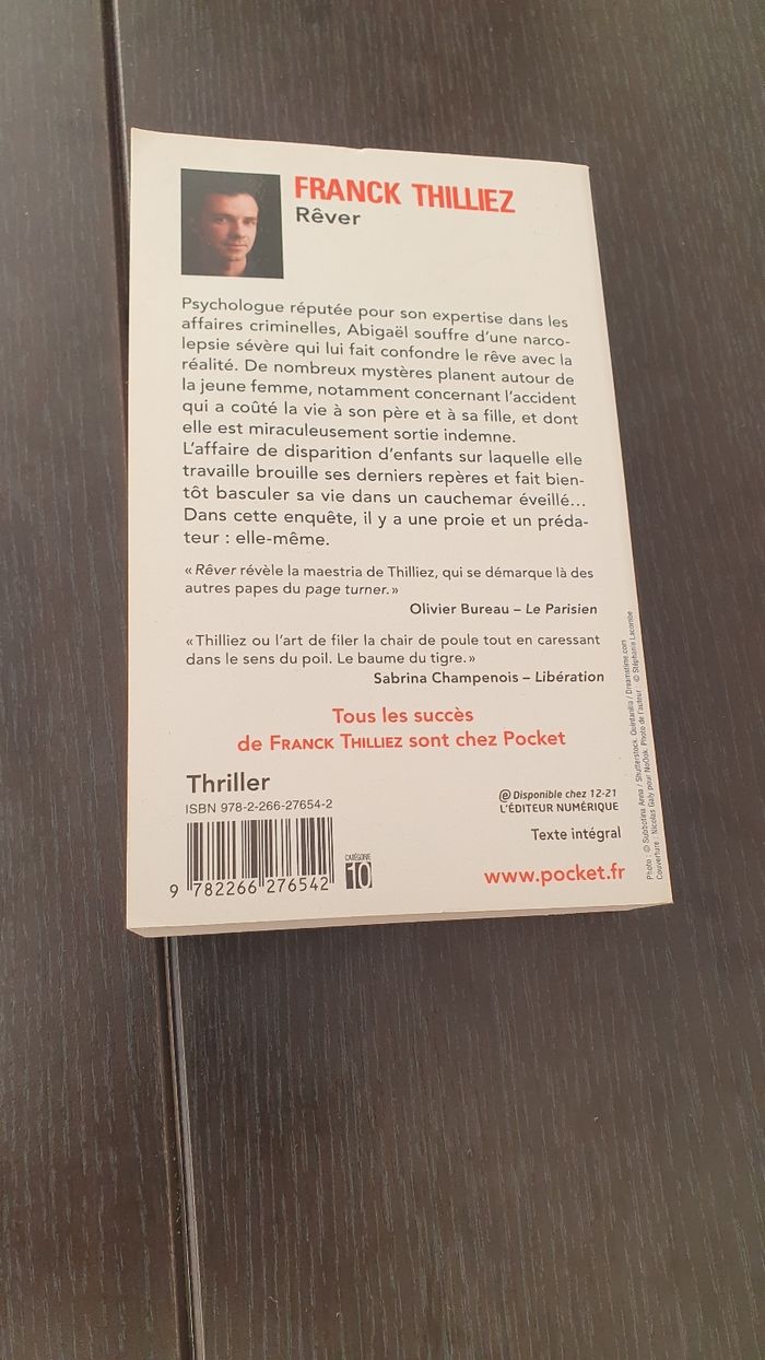 Je vends ce roman policier "Rêver" de Franck Thilliez. - Titre : Rêver - Auteur : Franck Thilliez - Éditeur : Pocket - Genre : Policier Très bon état N'hésitez pas à me contacter pour plus d'informations !