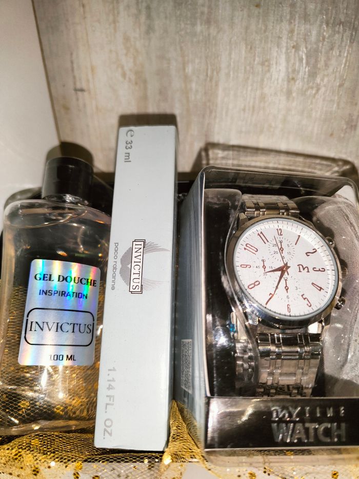 Coffret homme neuf comprenant 1 parfum 1 gel douche 1 montre 1 panier de rangement