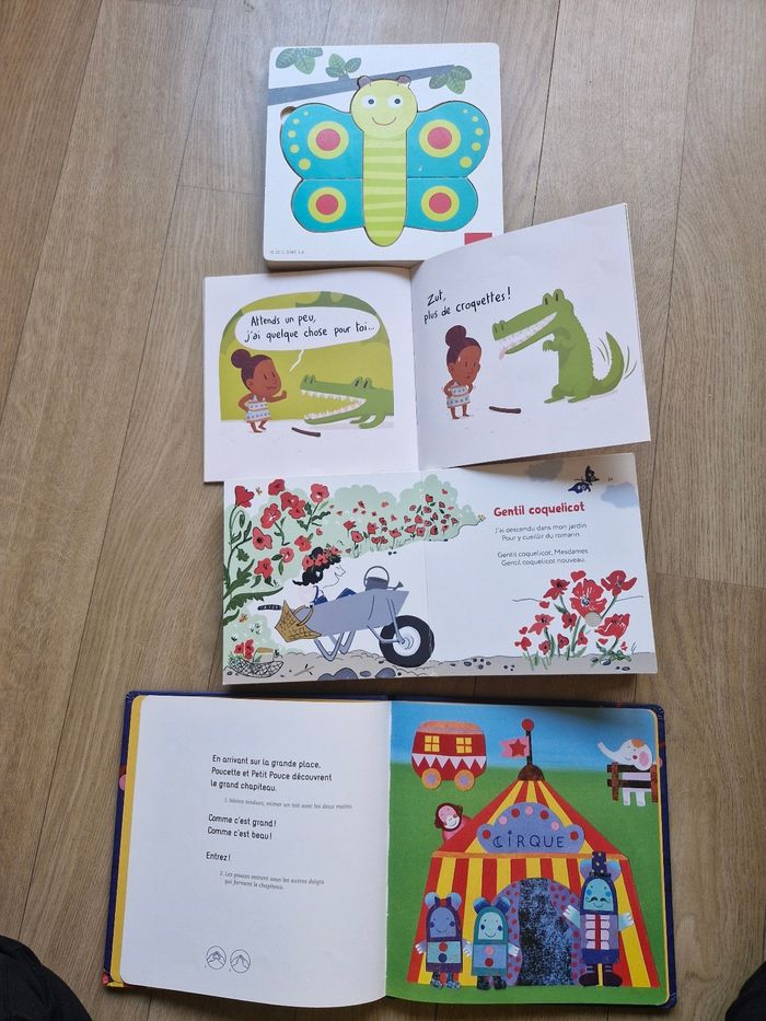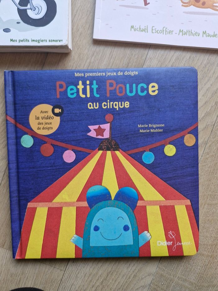 - livre Mes Premiers jeux de doigts Petit Pouce au cirque, avec la vidéo des jeux de doigts à regarder (qr code), il y a aussi des explications écrites