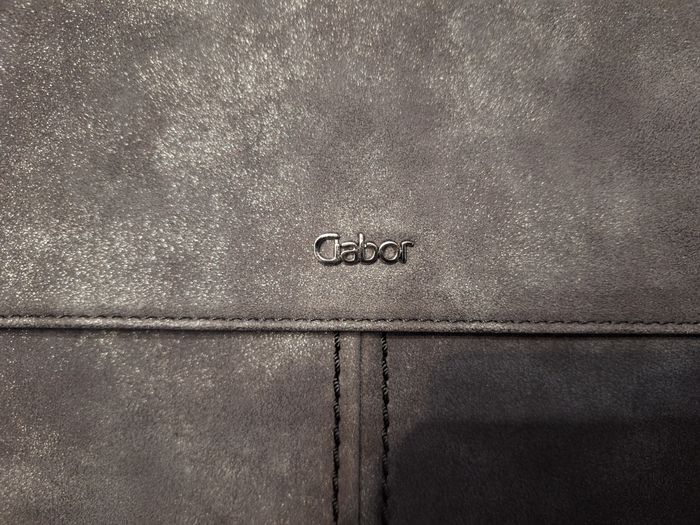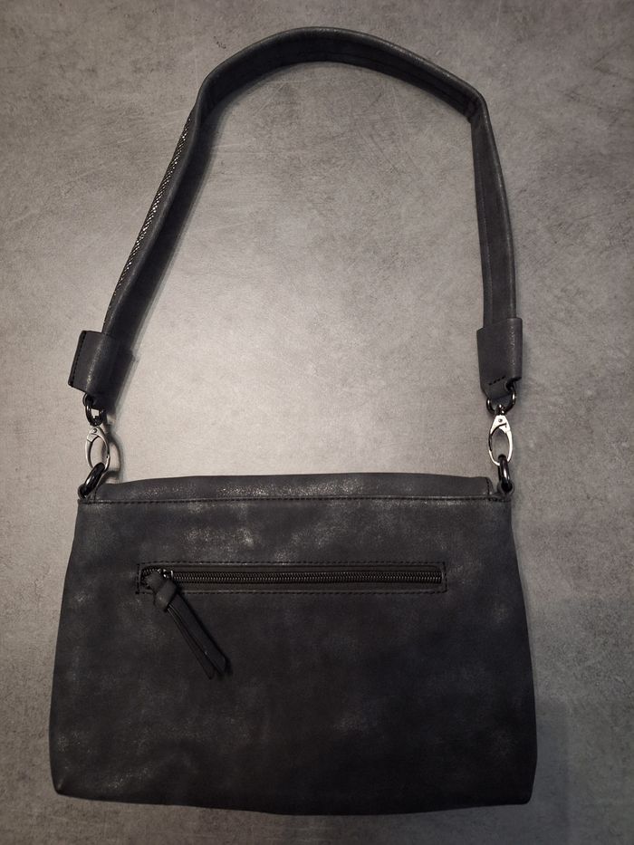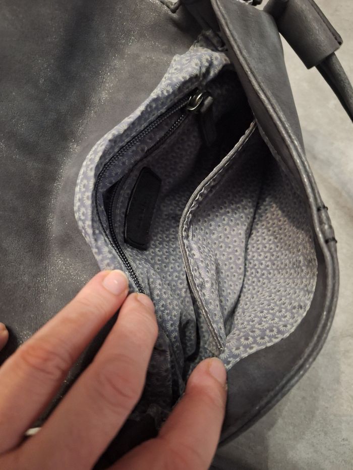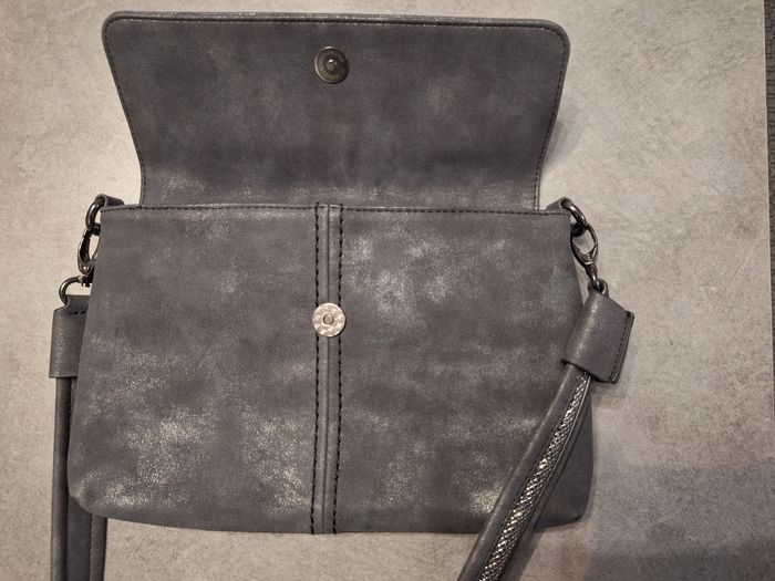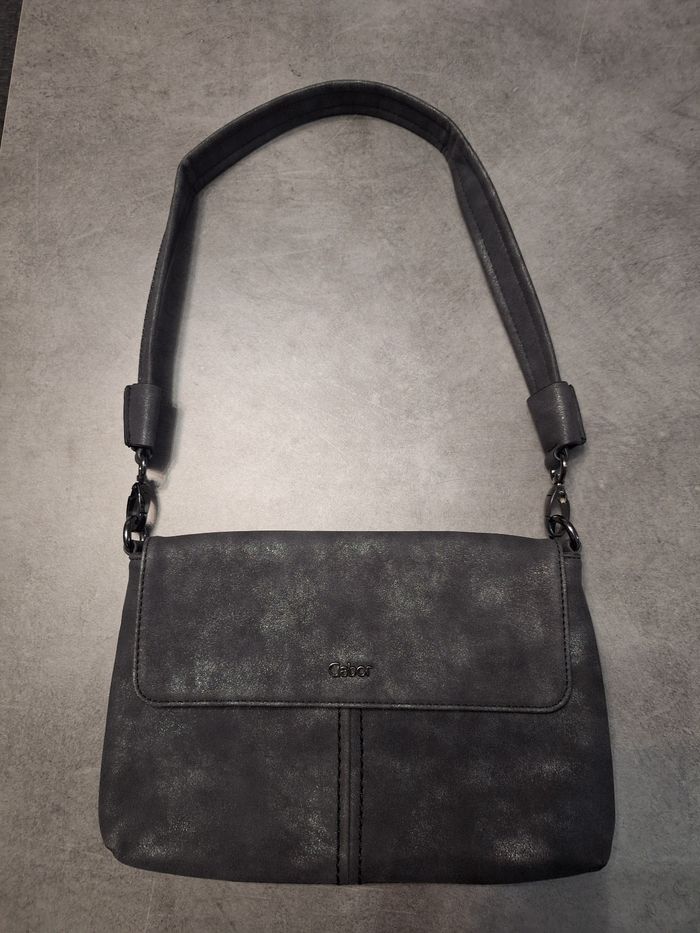 Joli petit sac à main gris, bandoulière amovible avec insert tissu brillant, fermeture par pression aimante, 2 petites poches intérieures dans poche principale dont 1 avec fermeture éclaire, poche dos avec fermeture éclaire, marque Gabor, environ 19x28 cm, peu servi en très bon état