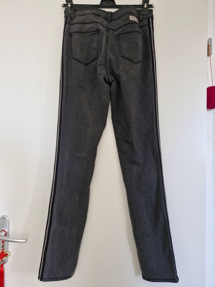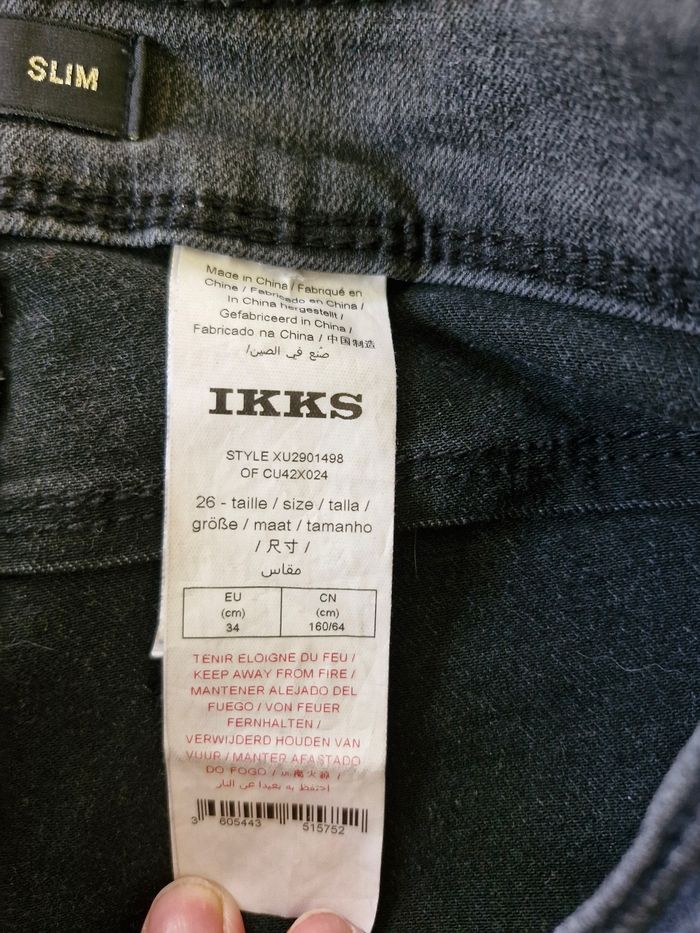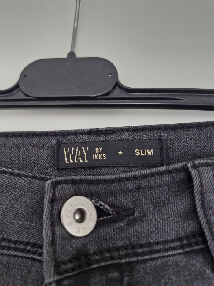Jean slim stretch de la marque IKKS, gris avec des coutures brillantes Le long du pantalon, hyper original.