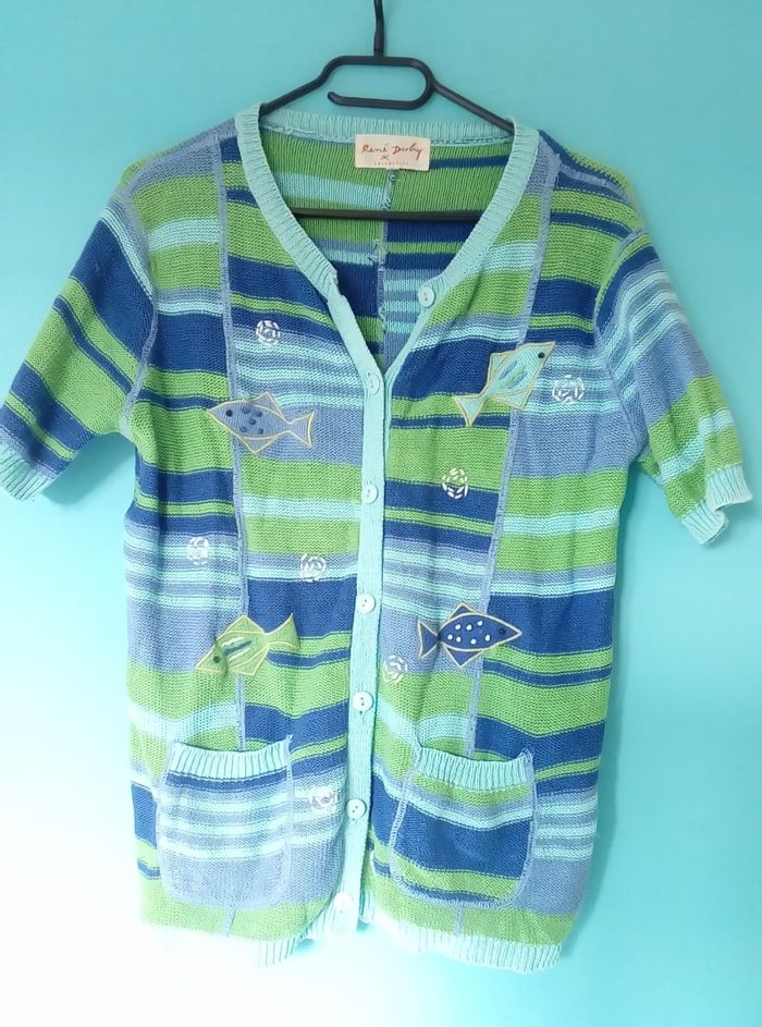 🐠 Gilet René Derhy taille 36 🐠 Très bon état 🐠 #gilet #renéderhy #taile36 #vert #pull #vintage #poissons #vetementT36selena2477