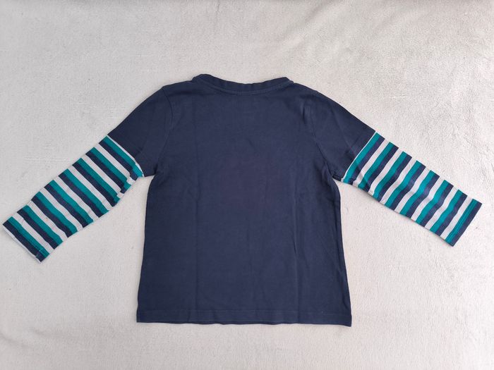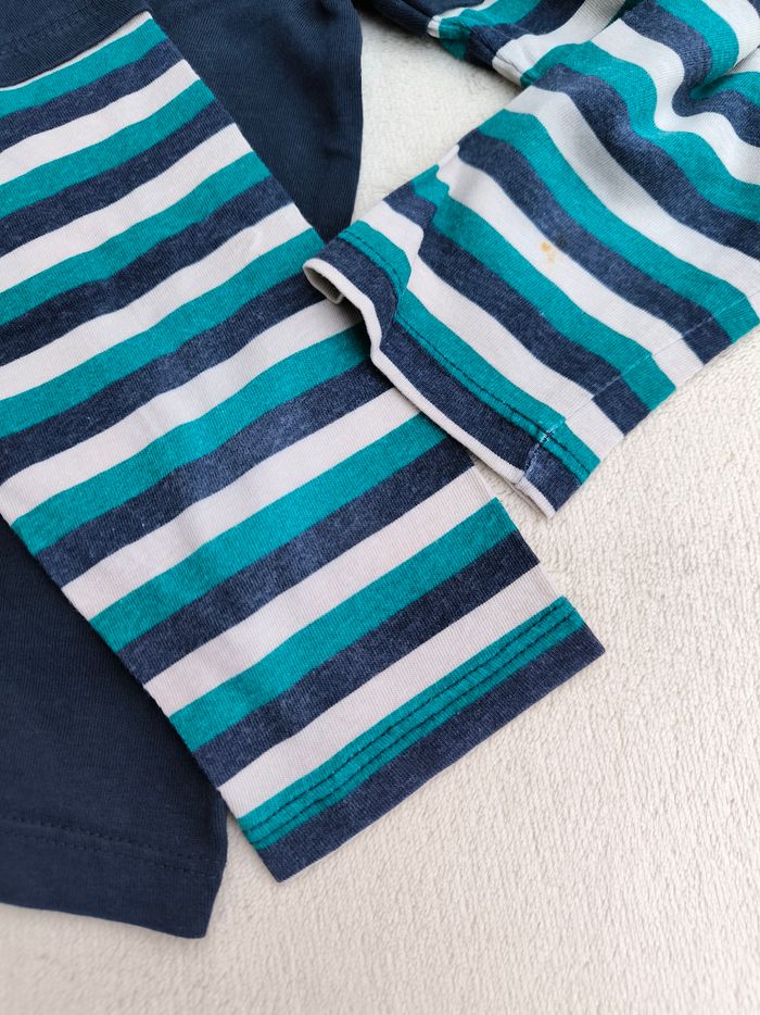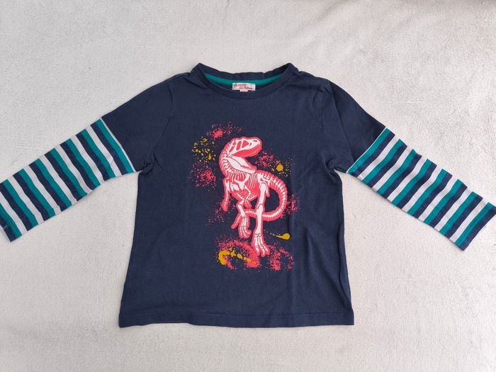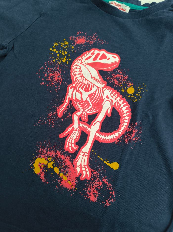 T-shirt à manches longues Marque Du Pareil au même Taille 5 ans, 110 cm • Coloris marine, rouge, blanc, jaune, bleu • Imprimé dinosaure, rayures horizontales aux manches • Tissu fin • Bas d'une manche avec petites taches En très bon état #evelyne_garcons_5ans #evelyne_garcons