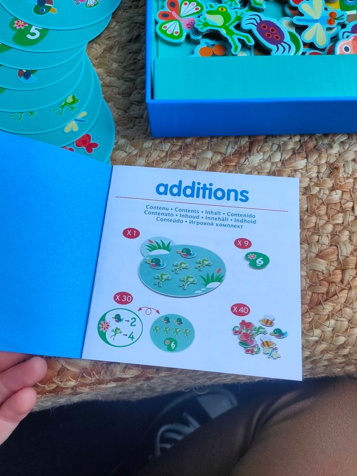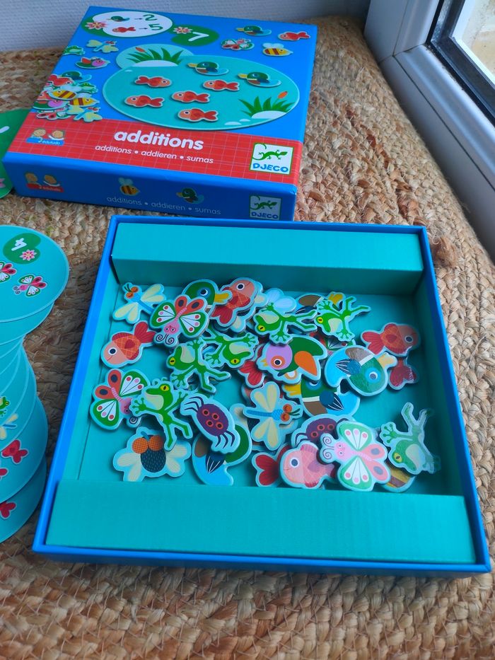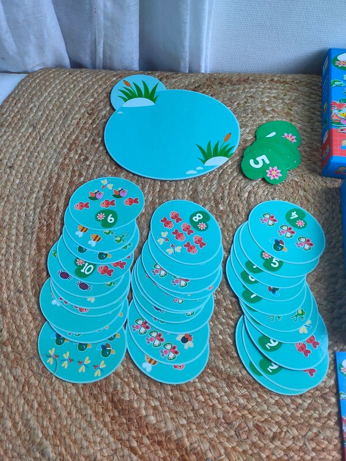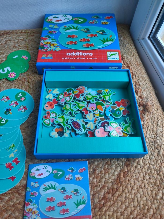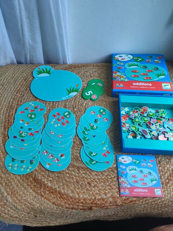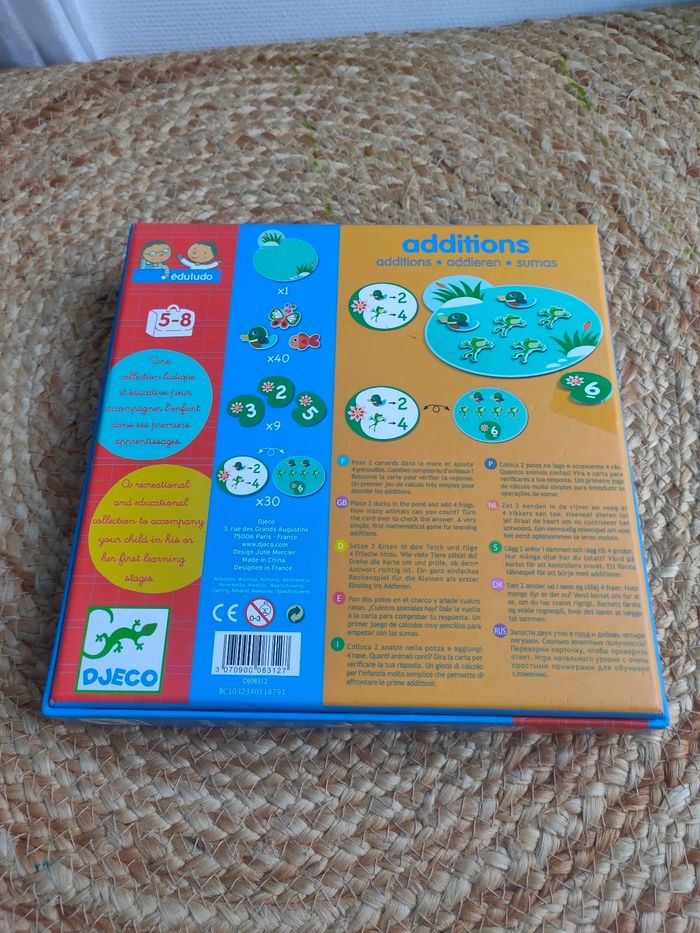 dditions est un jeu éducatif simple qui accompagnera les premiers pas de vos enfants dans le calcul mathématique. Chacune des 30 cartes défi proposera d'ajouter dans la marre un nombre donné de 2 types d'animaux. L'enfant devra compter combien d'animaux il y a en tout dans la marre. Les réponses au dos des cartes défis permettent à l'enfant de vérifier le résultat. Le jeu est en très bon état, il est complet. Prix ferme, PAS DE NÉGO !!!!