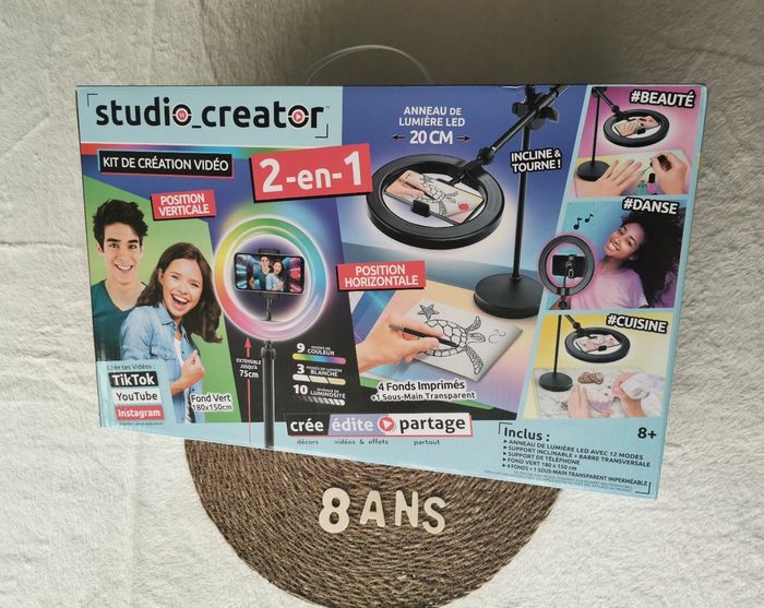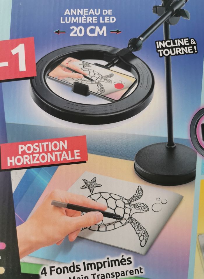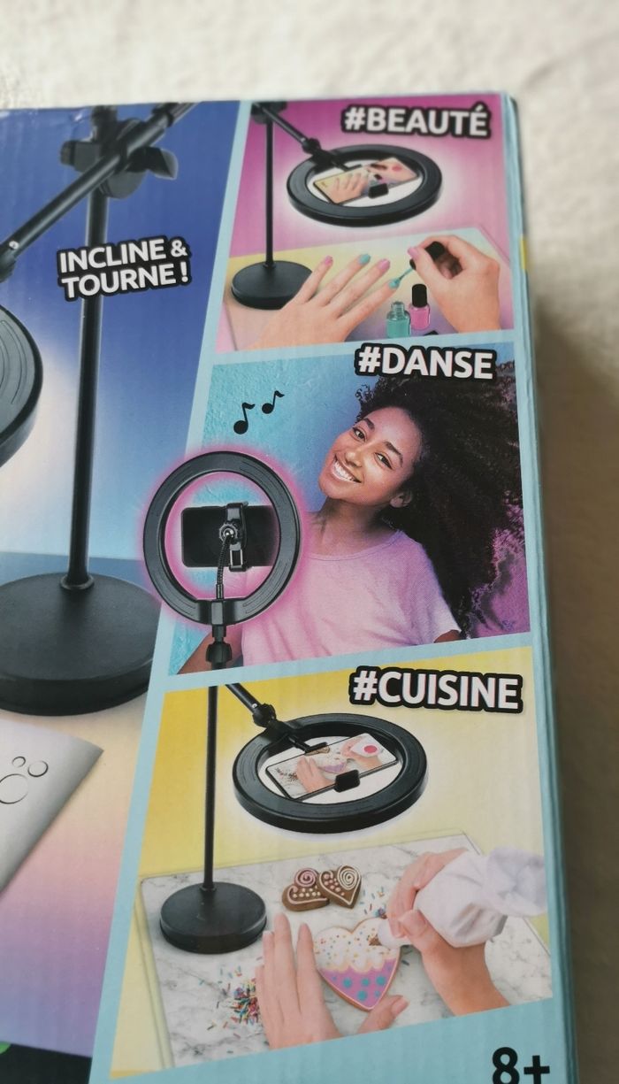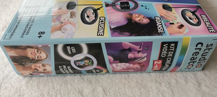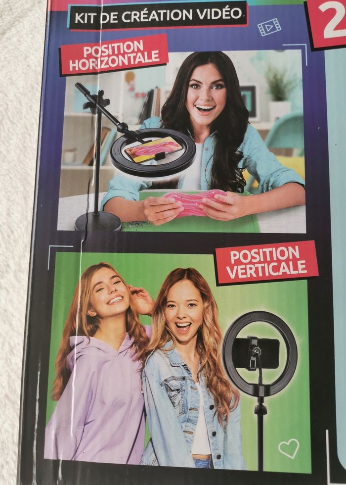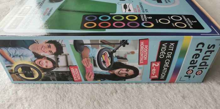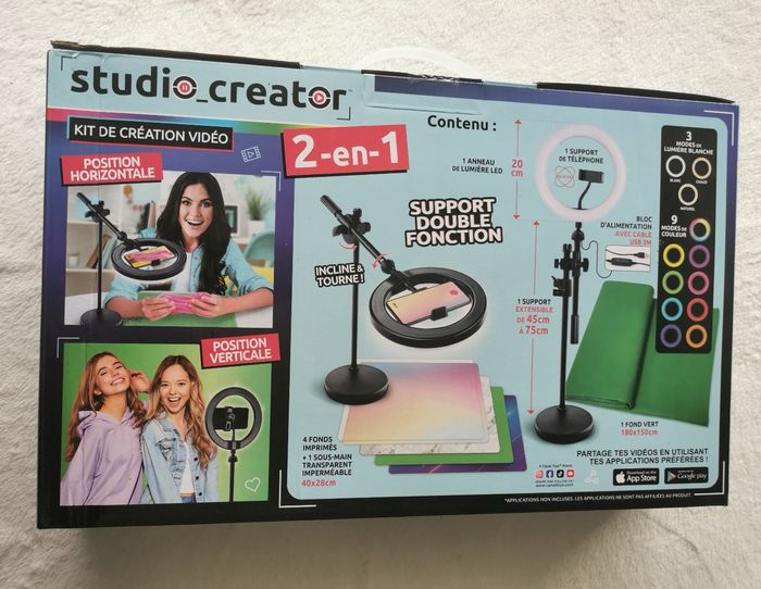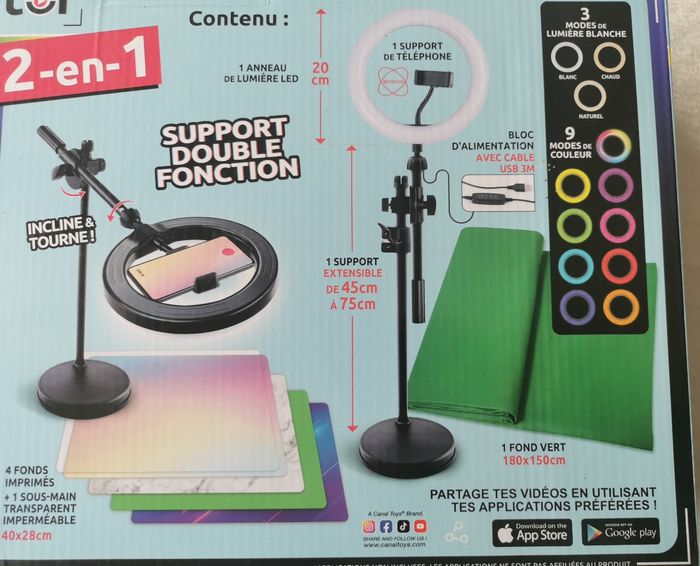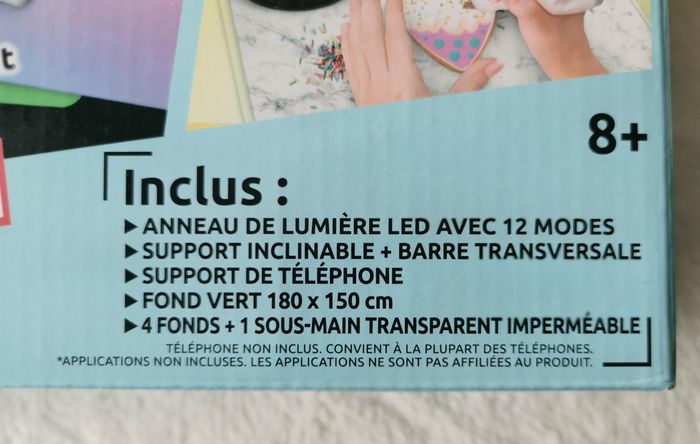 Inclus un anneau de lumière multicolore avec 12 modes et sa télécommande, un trépied ajustable en mode horizontal ou vertical (pied extensible 80 cm), un support de téléphone, un fond vert XL (180 cm x 150 cm), deux fonds imprimés recto-verso, un sous-main transparent imperméable et une notice.