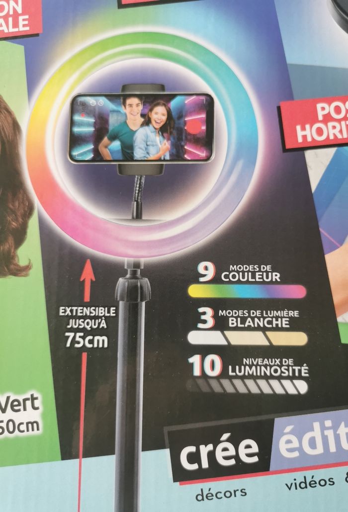 L'anneau de lumière comprend 12 modes d'éclairage pour choisir la lumière idéale pour ses vidéos ! 3 modes de lumière blanche et 9 de couleur sont possibles, pour une maîtrise parfaite de l’ambiance de ses vidéos. Contrôle la puissance de la luminosité avec la télécommande intégrée au câble USB.