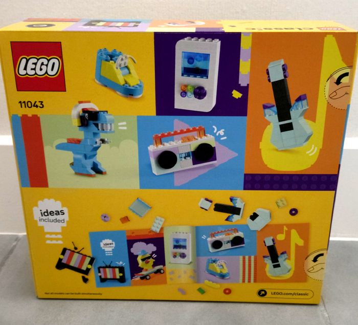 La boîte créative cool LEGO Classic (11043) déborde de maquettes à construire qui stimulent le jeu créatif chez les enfants de 5 ans et plus. Avec 510 briques LEGO colorées, ainsi que des roues et d'autres éléments, garçons et filles peuvent construire et combiner un large éventail de jouets tendance et réaliser leurs propres créations. Les nombreuses briques colorées, ainsi que les yeux, les roues et les charnières, maximisent la jouabilité de ce jouet de construction aux nombreuses options de jeu. Manette de jeu, dinosaure à lunettes, téléphone pliant, skateboard, monster truck et équipement de DJ avec casque, toutes ces maquettes peuvent être combinées et personnalisées pour un jeu encore plus amusant. Imaginez mettre le casque sur le dinosaure et le dinosaure sur le skateboard !