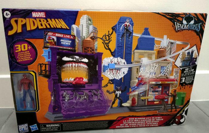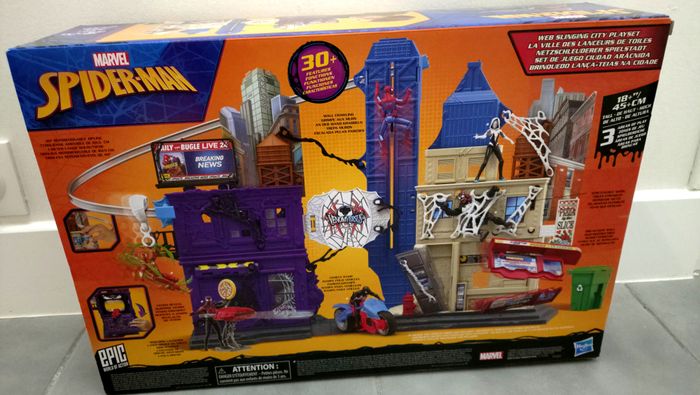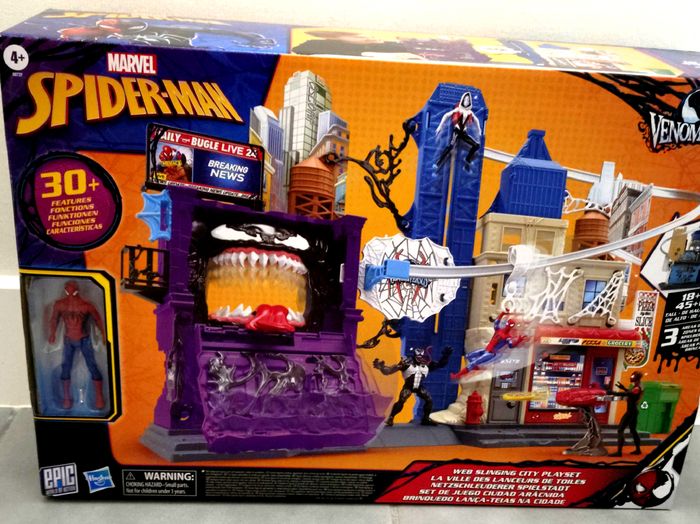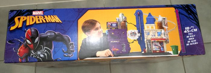 Ce coffret géant de Spider-Man transporte les enfants dans l'univers urbain du super-héros. Avec ses plus de 30 fonctions, il propose un environnement vertical de plus de 45 cm de haut à explorer, où la figurine Spider-Man de 10 cm peut grimper, se suspendre, viser et piéger les ennemis. Grâce à une tyrolienne amovible de 96 cm, les enfants peuvent faire évoluer leur héros dans les airs, tandis qu'un visage menaçant de Venom apparaît à l'ouverture d'un mur basculant pour enrichir les scénarios de jeu.