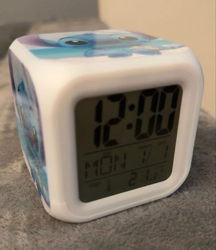 Fonction: Affichage de l'horloge numérique alimenté par une pile bouton (incluse), lumière LED alimentée par un câble USB (inclus) ou 4 piles AAA (non incluses) - lorsque vous appuyez sur le haut de l'horloge, la lumière LED lumineuse avec 7 couleurs différentes change environ 3-5 secondes - Affichage de l'heure, semaine de données et température - Prend en charge le format d'heure 12 heures et 24 heures, le calendrier, la température et l'alarme. Si vous avez réglé l'alarme avec succès, l'écran de l'horloge affichera le symbole de l'alarme.