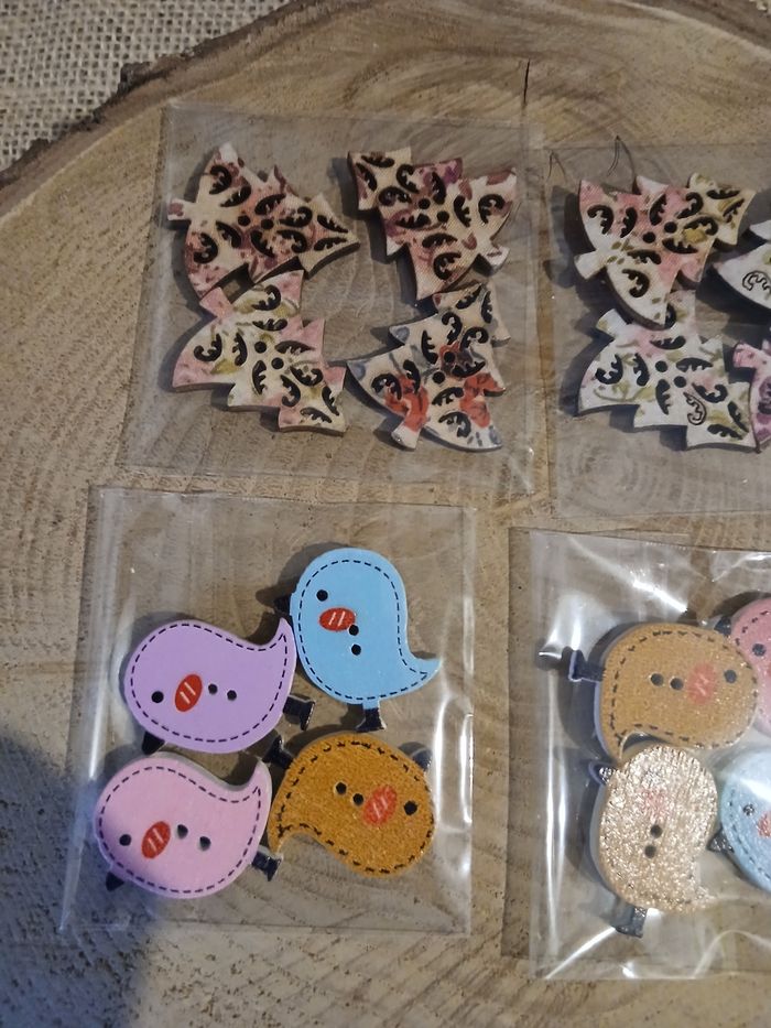 Lot de 4 sachets de boutons en bois sapins de Noël et oiseaux D'autres tissus ruban boutons perles et accessoires biais ect... de dispo ds mon dressing n'hésitez pas à jeter un coup d'œil ou à me demander.