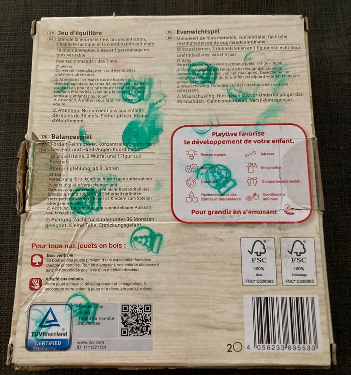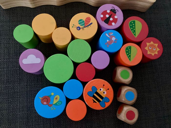 1 jeu d’équilibre de 21 pièces en bois pour initier l'enfant à l’équilibre. Il développe la dextérité de l’enfant ainsi que la patience : il peut empiler sur la bascule les pièces en bois ou bien placer les pièces indiquées par le dé sans tout renverser.