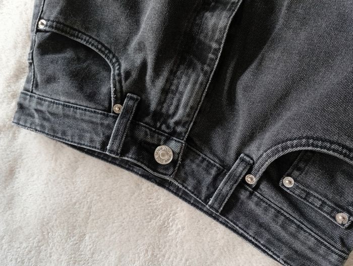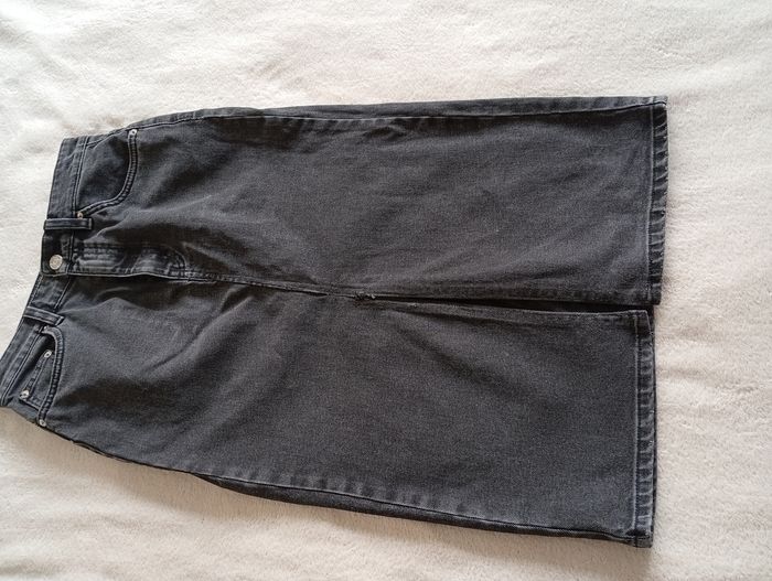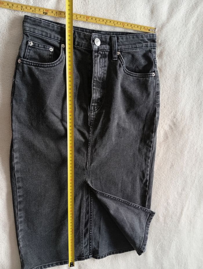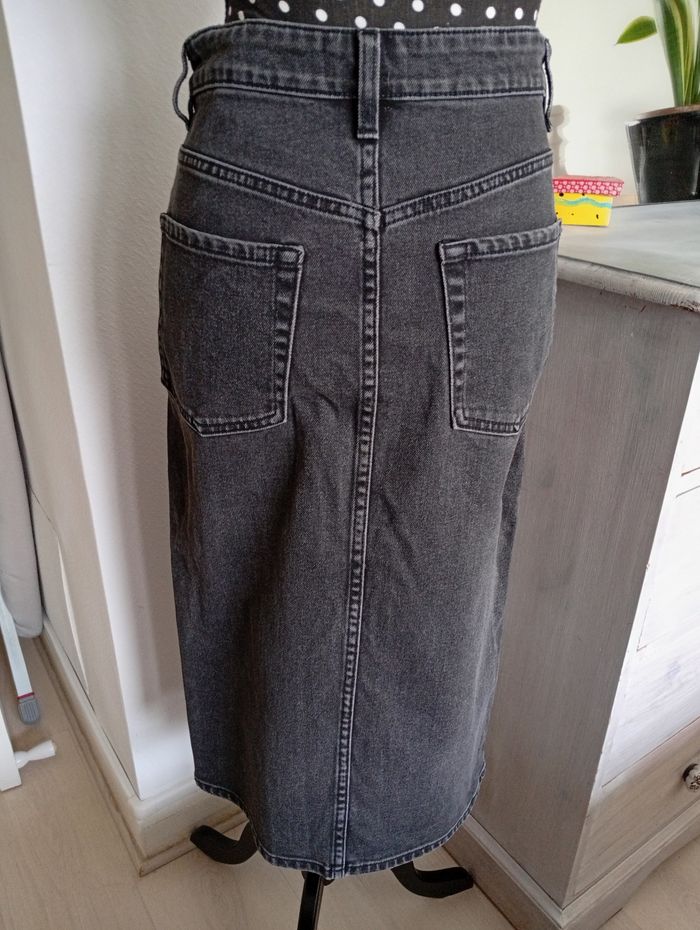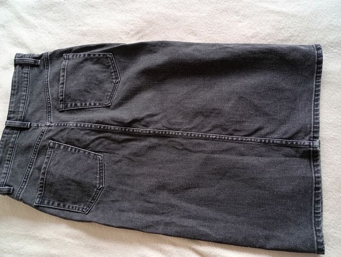 Jupe midi en jeans, couleur gris/ noir en très bon état SAUF un peu décousu à la fente conforme aux photos.