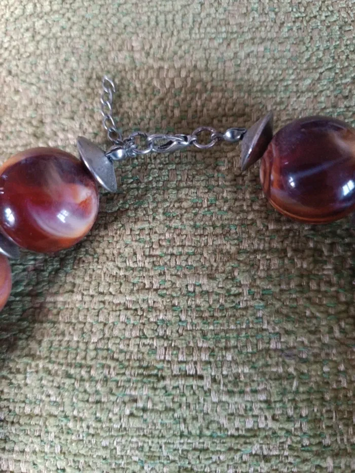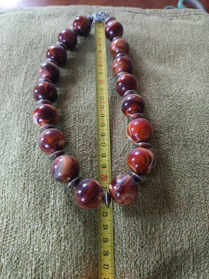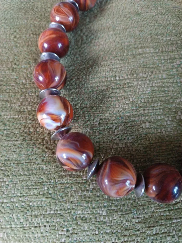 Collier grosses boules acrylique imitation jaspe 23 cm. Entre les perles rondelles métal. Poids 150 grammes. Fermeture mousqueton. TBE