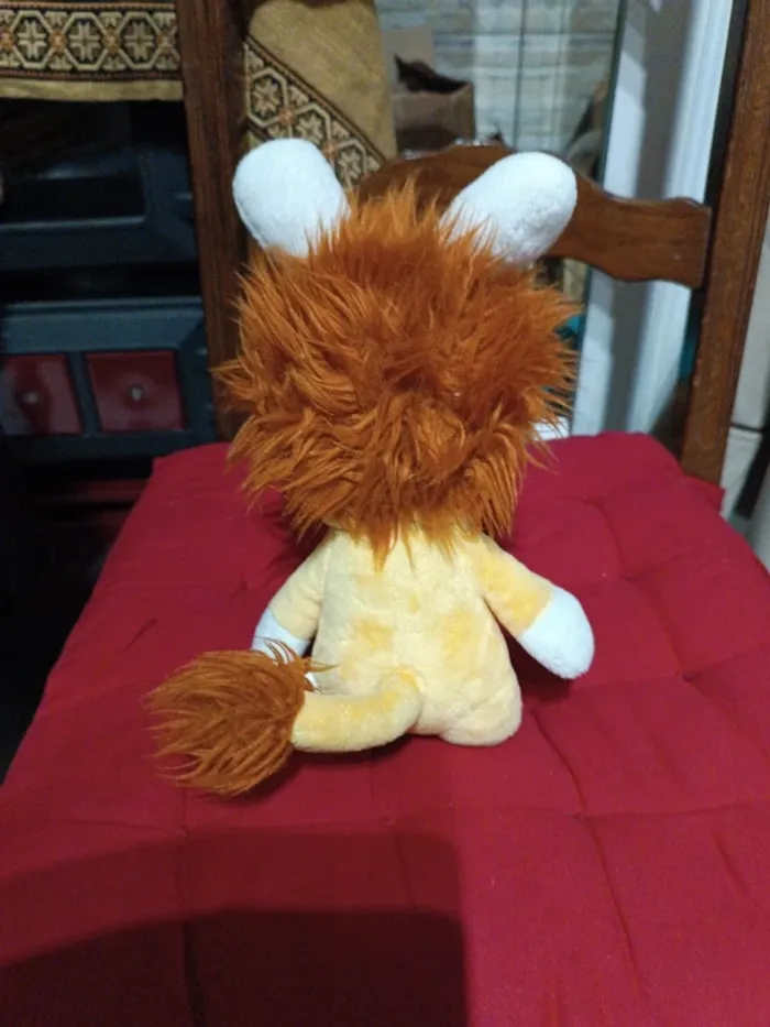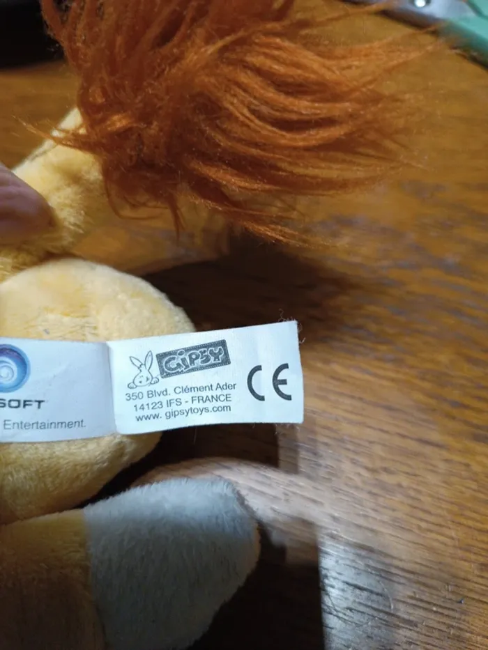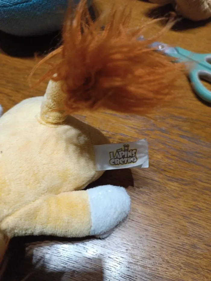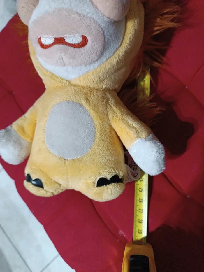 Peluche Lapin Crétins à capuche lion Gipsy 26 cm. Velours polyester jaune. Crinière rousse à poils longs 3 cm. TBE