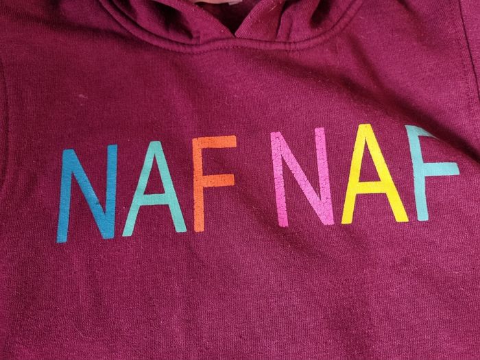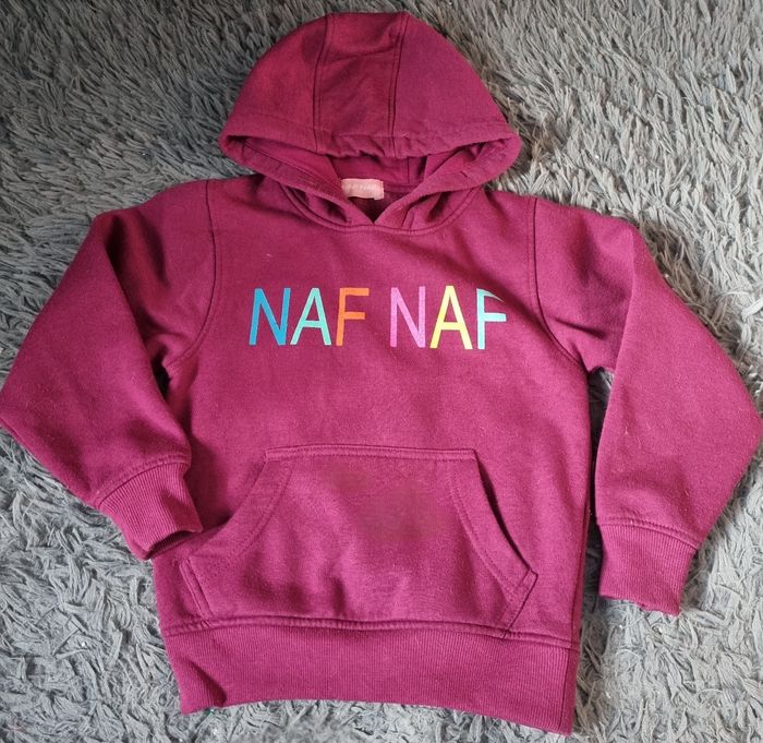 Sweat à capuche violet, taille 5ans marque Naf Naf (écriture légèrement craquelé),poche ventrale,intérieur molletonnée.