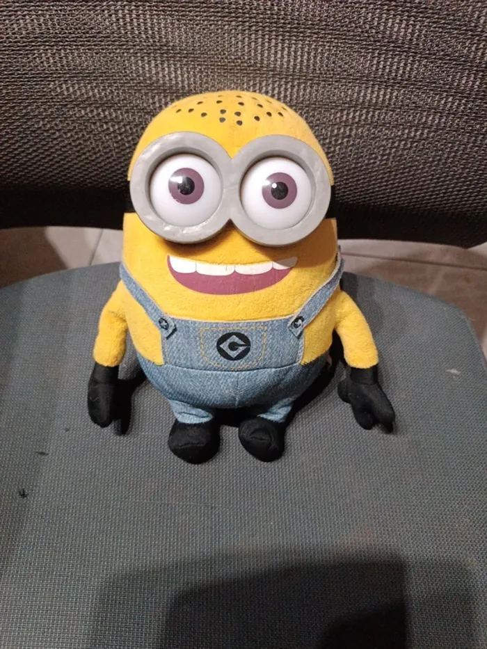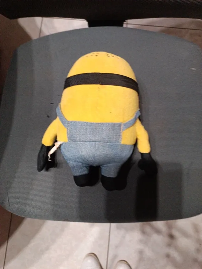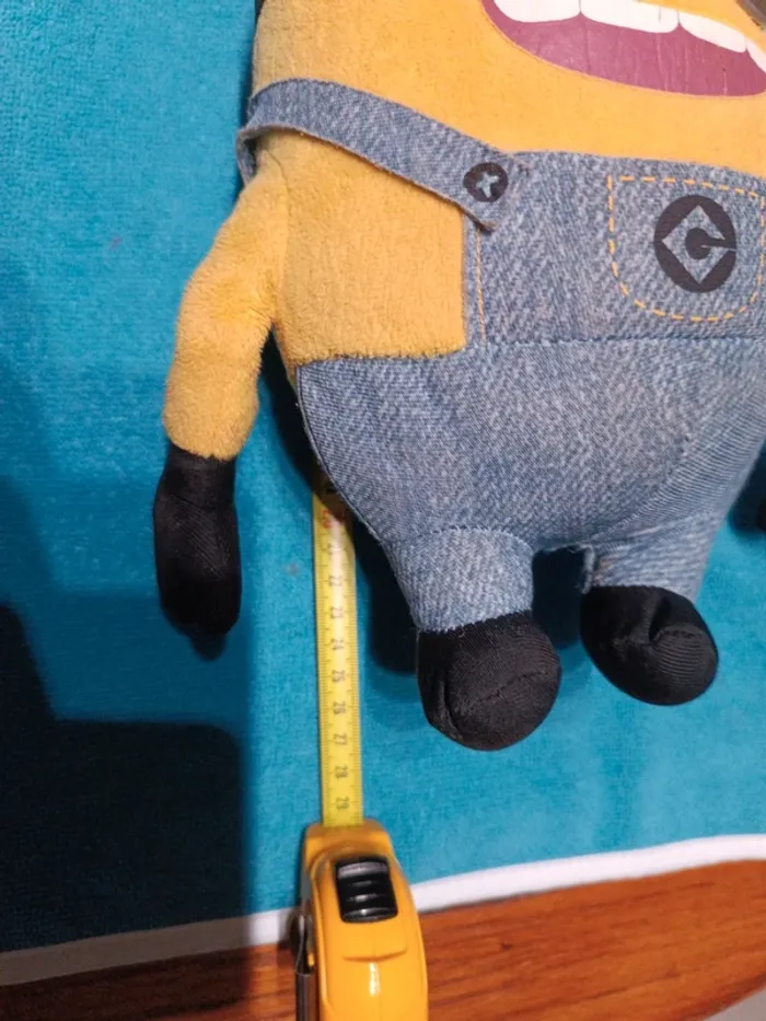 Peluche velours jaune Mignon 26 cm. Salopette coton bleu. Lunettes et yeux en plastique. Tissu velours Polyester. TBE