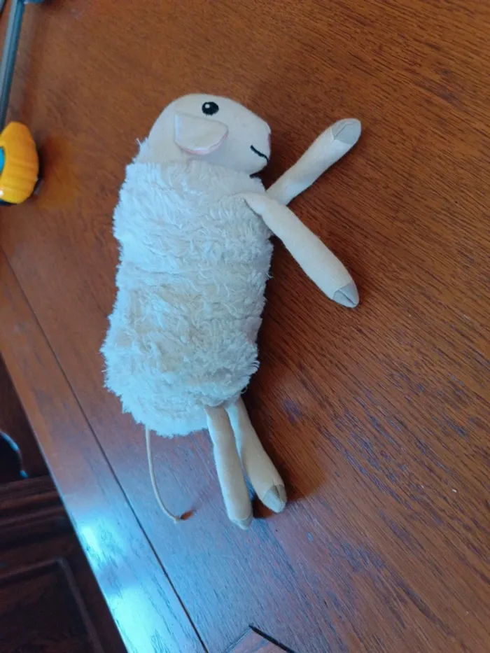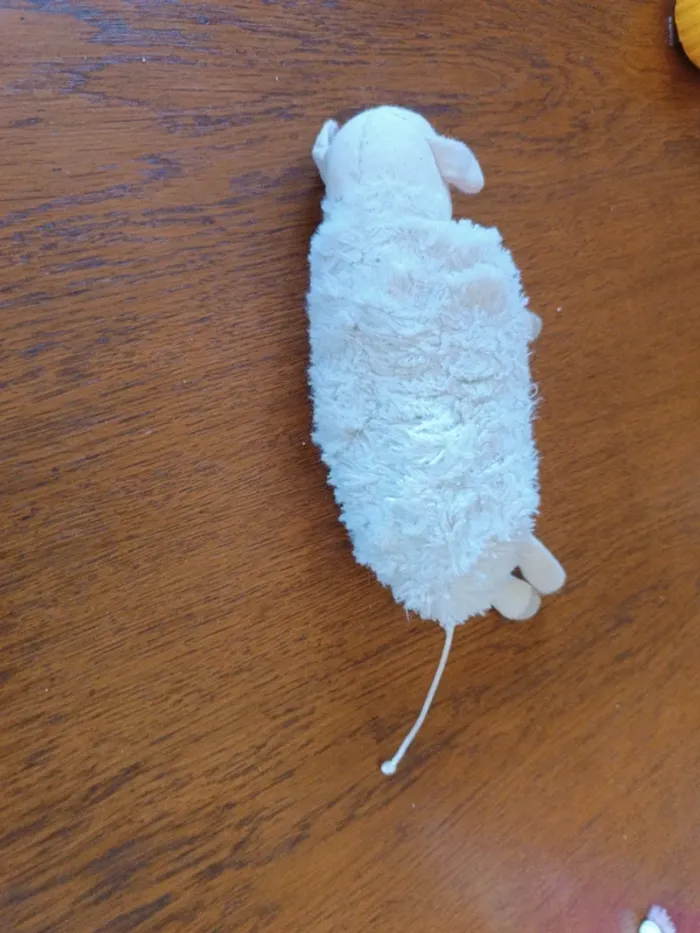 Peluche musicale Mouton blanc, 18 cm. Tire la queue et je m'allonge de 25 cm, je rétrécit en musique. Bon état.
