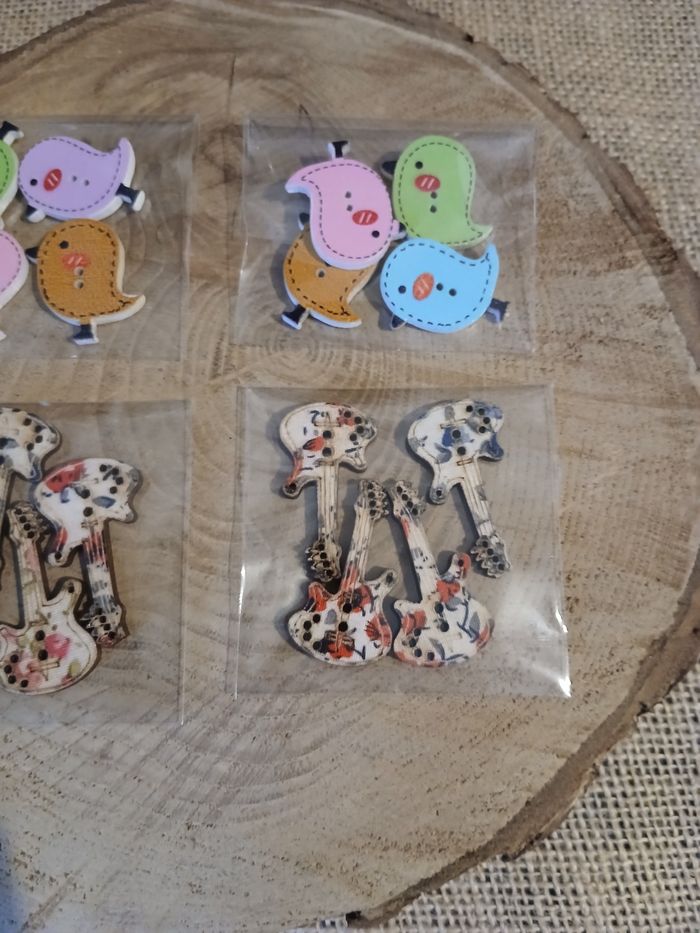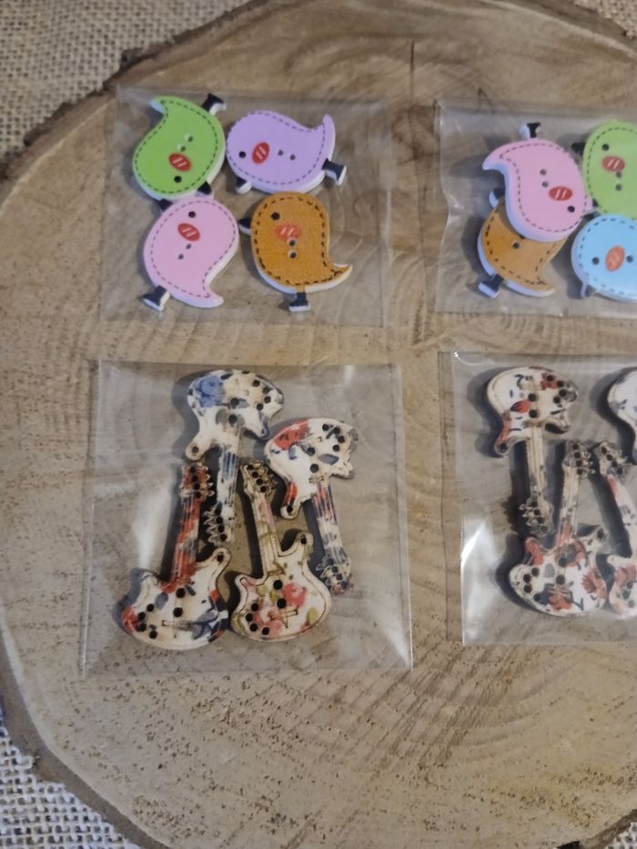 Lot de 4 sachets de boutons en bois guitare et oiseaux D'autres tissus ruban boutons perles et accessoires biais ect... de dispo ds mon dressing n'hésitez pas à jeter un coup d'œil ou à me demander.