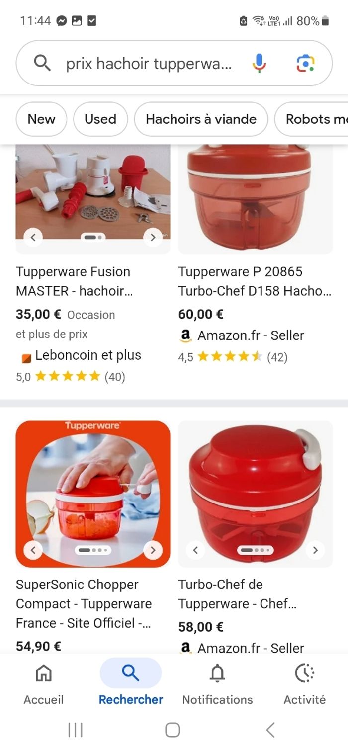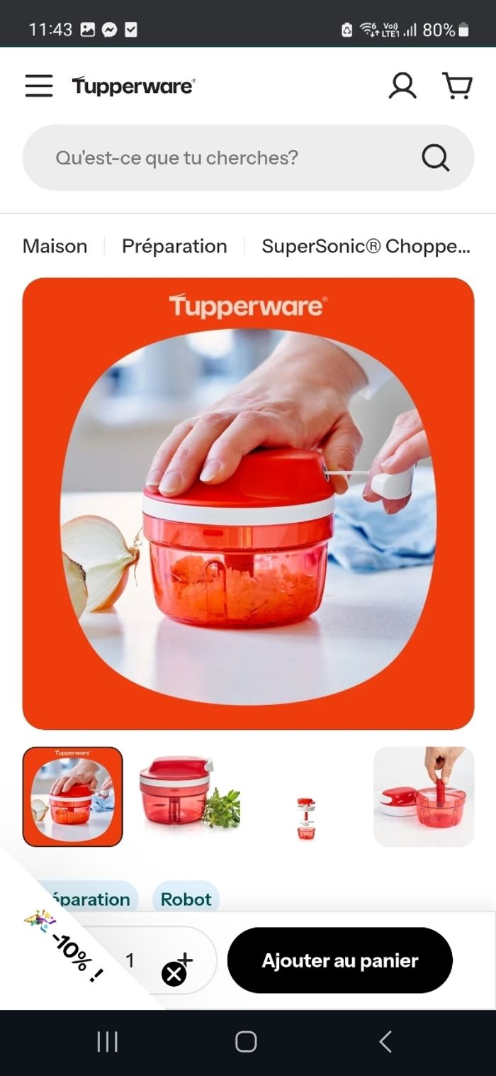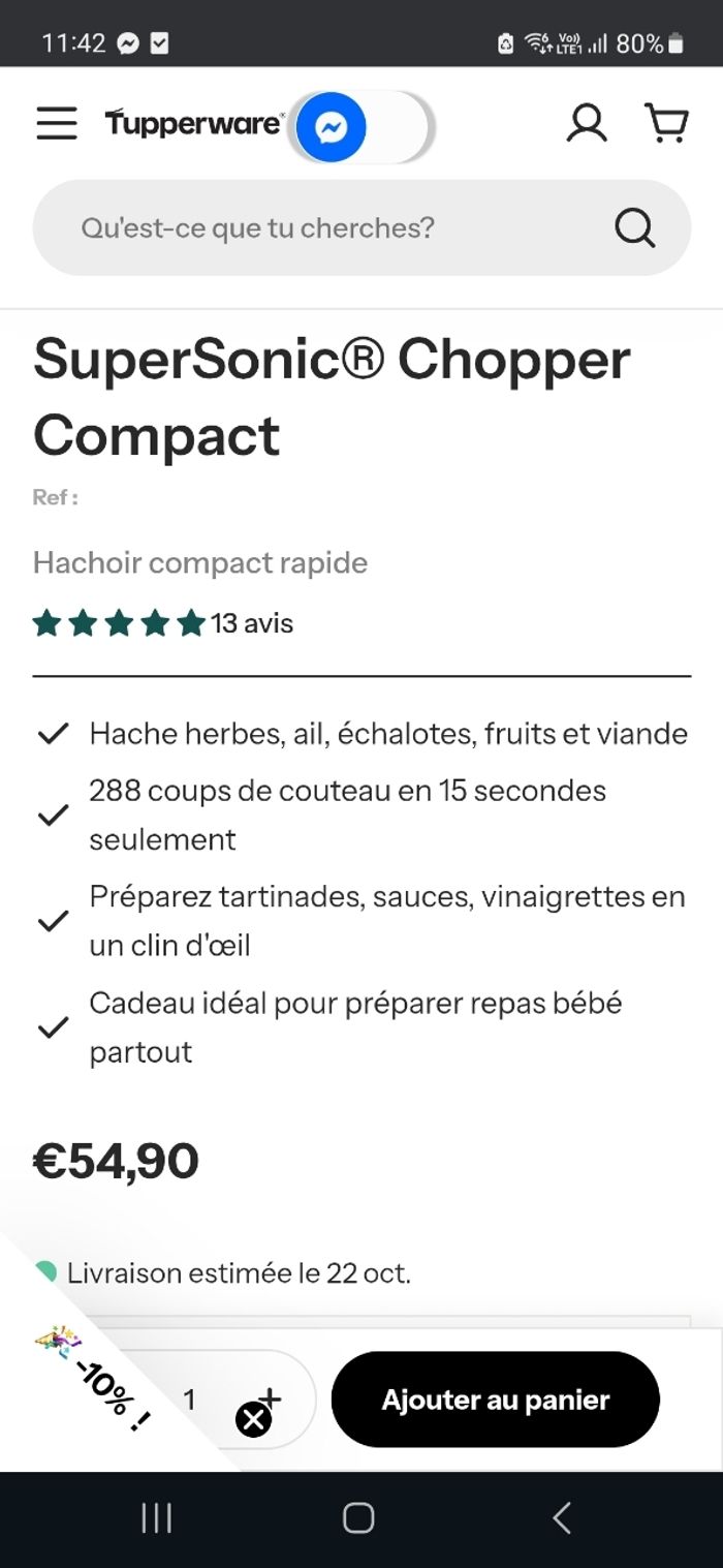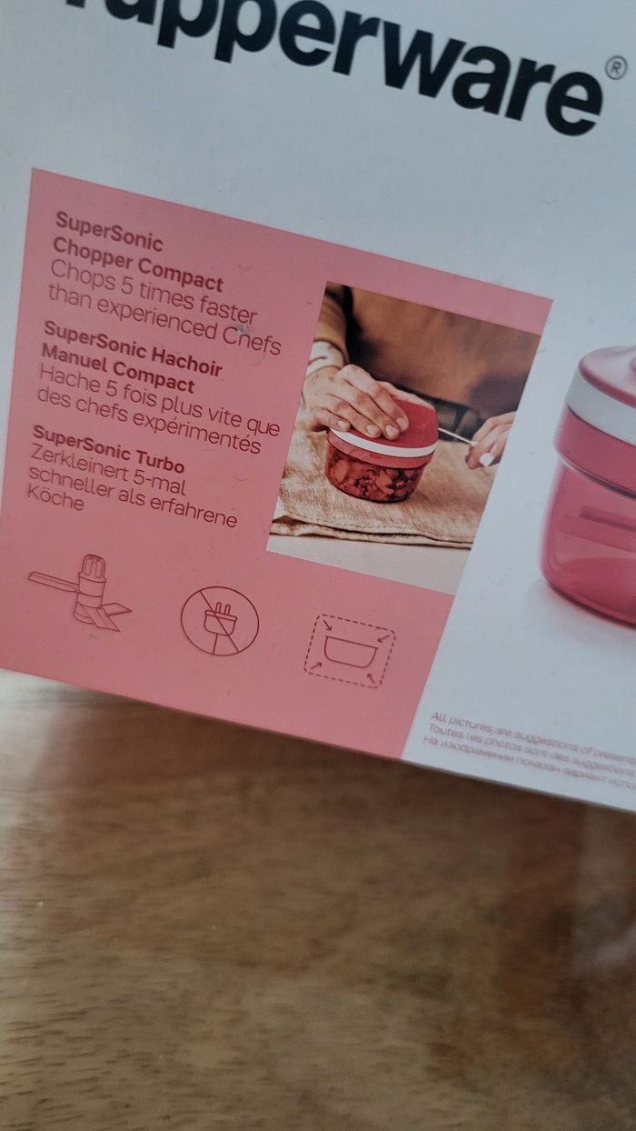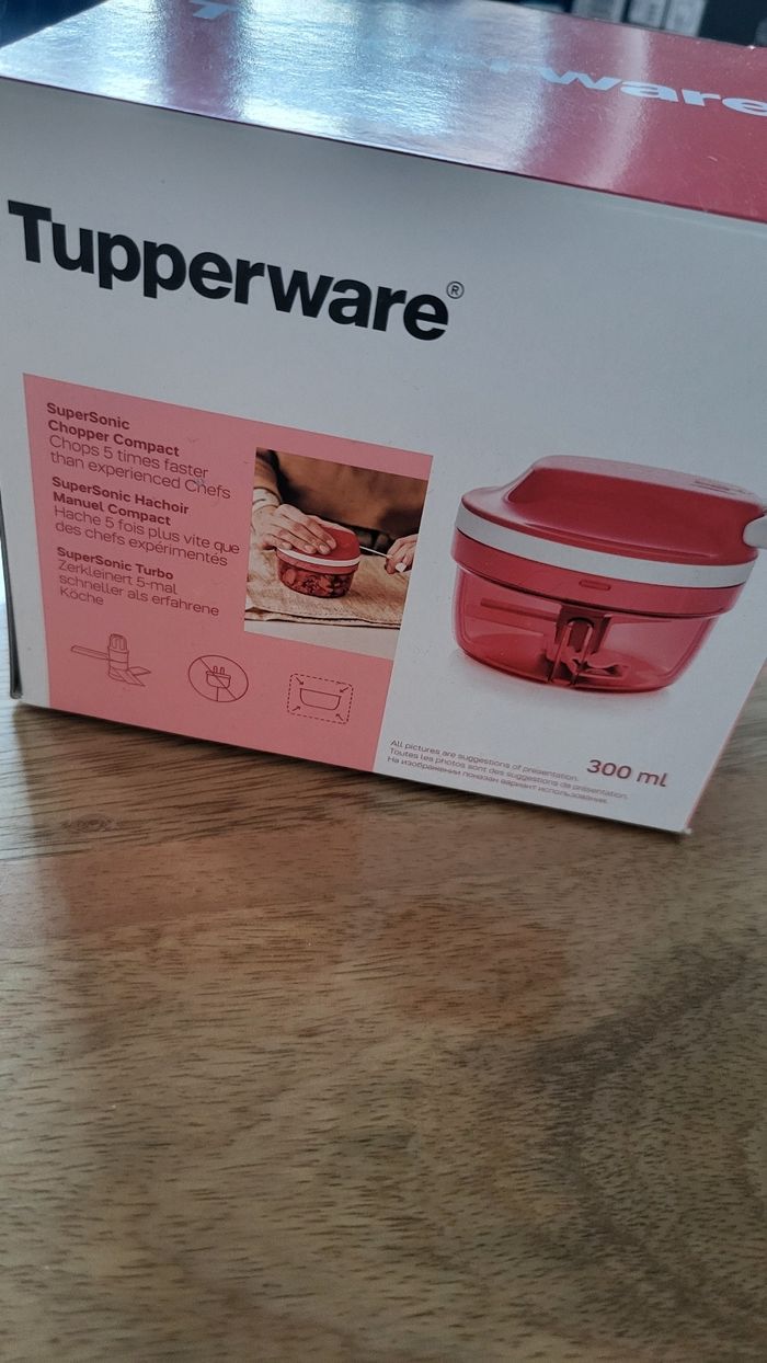 Supersonic chopper compact tupperware neuf permet de haché herbes ,ail, oignons échalotes,fruits, viande, légumes ect très révolutionnaire idéal pour les repas de bébé permettant de faire des compote des tartinades des sauces pas mal de choses au quotidien l'appareil est neuf jamais utilisé prix en magasin 54,90 pour un jolie cadeau 🎁 à offrir à Noël 🎅 ou simplement vous faire plaisir n'hésitez pas à visiter mon dressing réduction activé envoie des colis très rapidement il y a également les réductions sur la plate-forme n'hésitez pas pour toute question ❓️ je vous y répondrai avec plaisir.