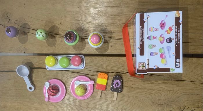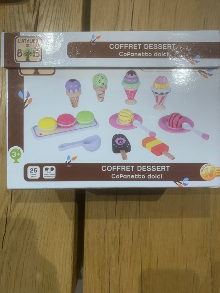 Coffret dessert 25 pièces en bois complet l’atelier du bois dans son carton d’origine en bon état des marques d’usures ⚠️derrière les deux assiettes des marques de stylo qui ne partent pas voir photo 4